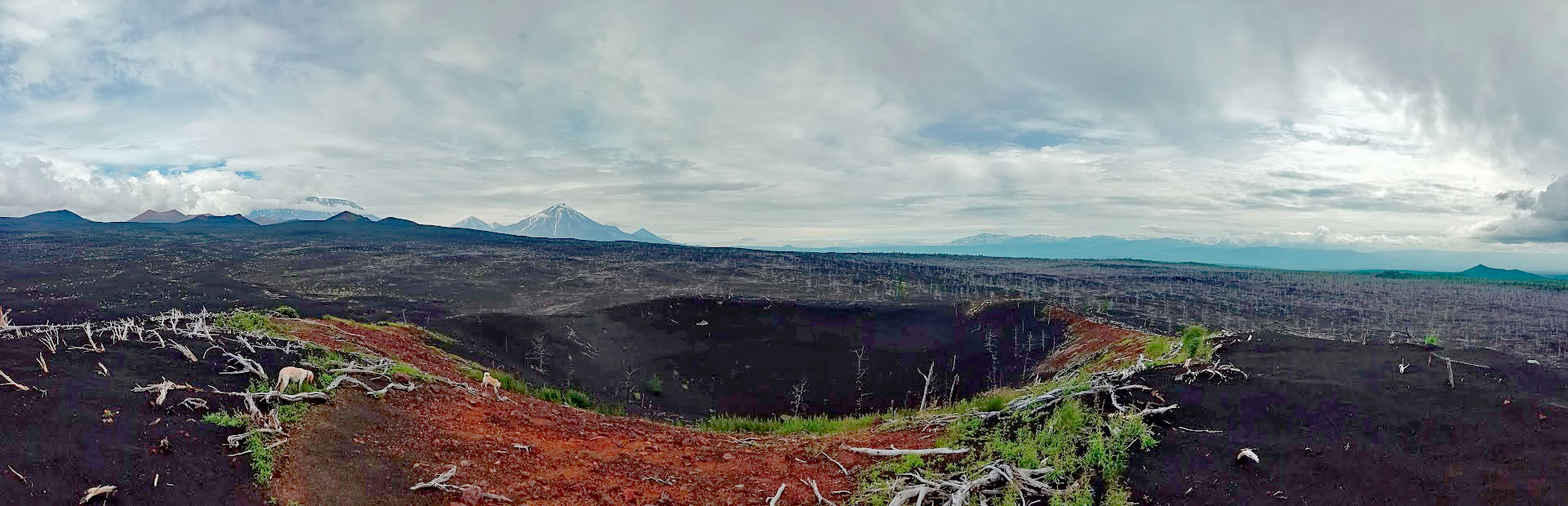 Добавлю своих фото. На Толбачике был уже три раза. Живу на Камчатке. Поднявшись на одну из гор сделал такую панораму. Чтоб было понятно - глубина этого кратера в 16-тиэтажный дом. На заднем плане вулкан Большая Удина.