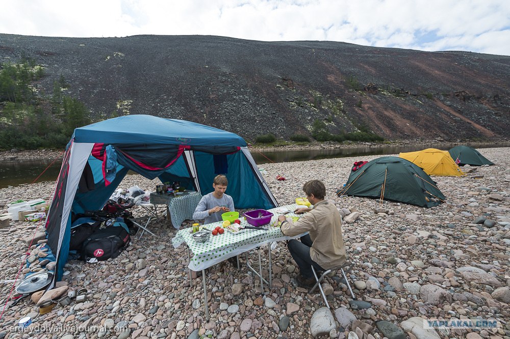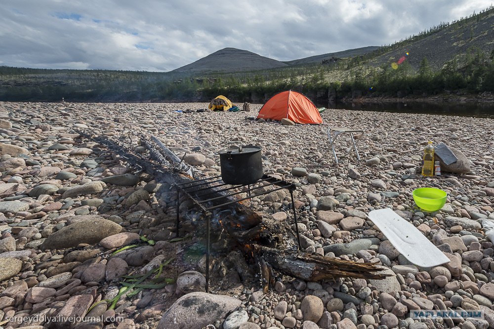 Так выглядел наш лагерь. На берегах Котуйкана практически нигде нет песка, поэтому приходилось ставить палатки на камнях. Еще у нас была общественная зона с костром. В лесу неподалеку было много сухого валежника: мы брали большие бревна и, чтобы не париться, жгли их целиком. Вертолетчики оставили нам канистру авиационного керосина, поэтому с разжиганием костра проблем не было: