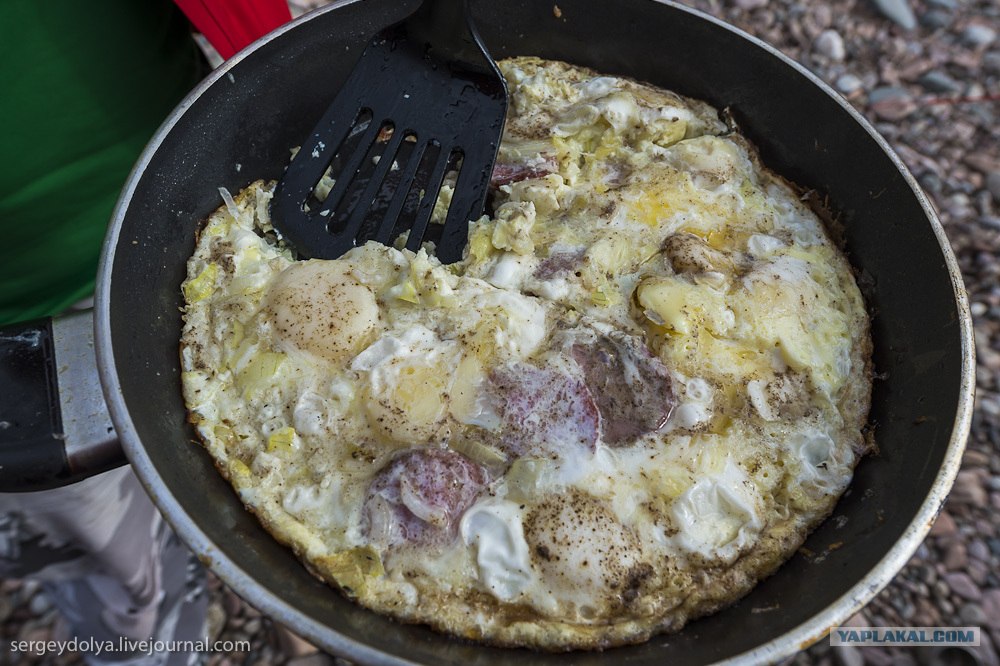 Мы с собой взяли несколько десятков яиц: большая часть побилась в вертолете, но из тех что остались первое время готовили омлет с колбасой на завтрак: