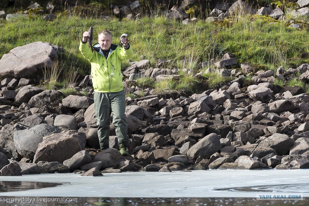 В первый же день начали ловить рыбу. В Котуйкане водится хариус, сиг и таймень, но в первый день удалось поймать только хариуса. Кстати, таймень занесен в красную книгу и мы его отпускали: