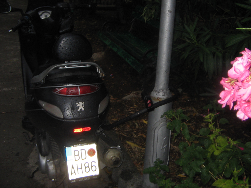 Вечереет, идём домой. Пежо заботится о безопасности, замок вытаскивается из корпуса как провод из пылесоса, первый раз такое видел!