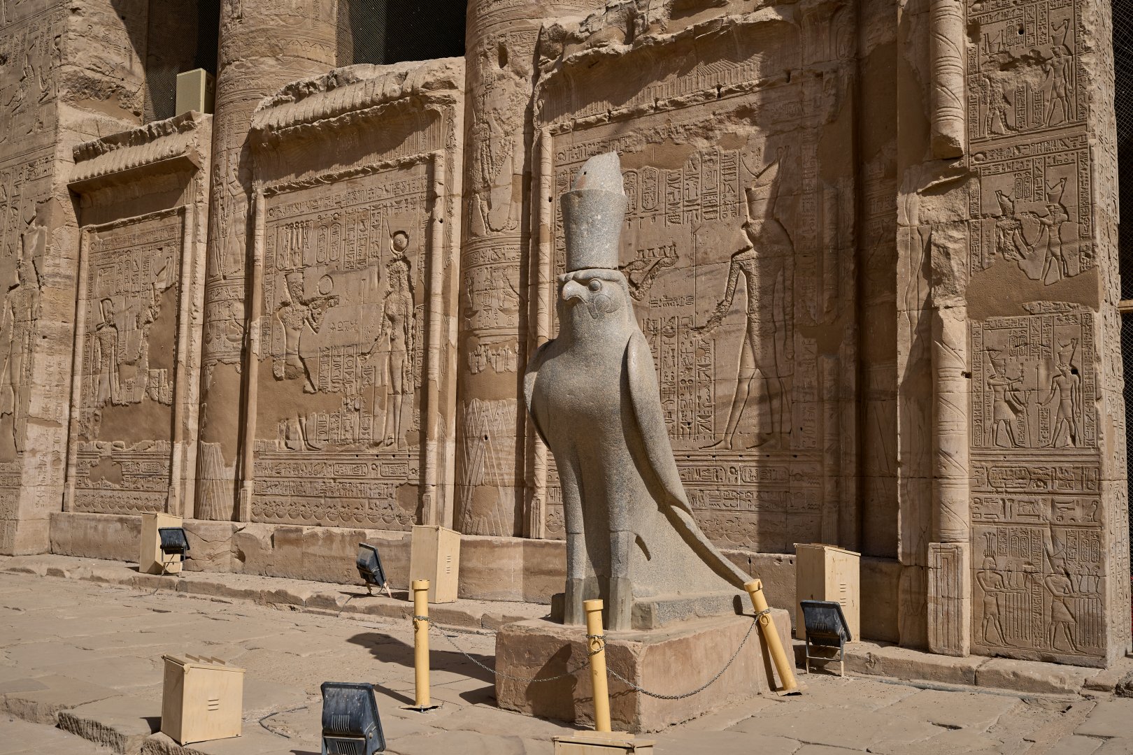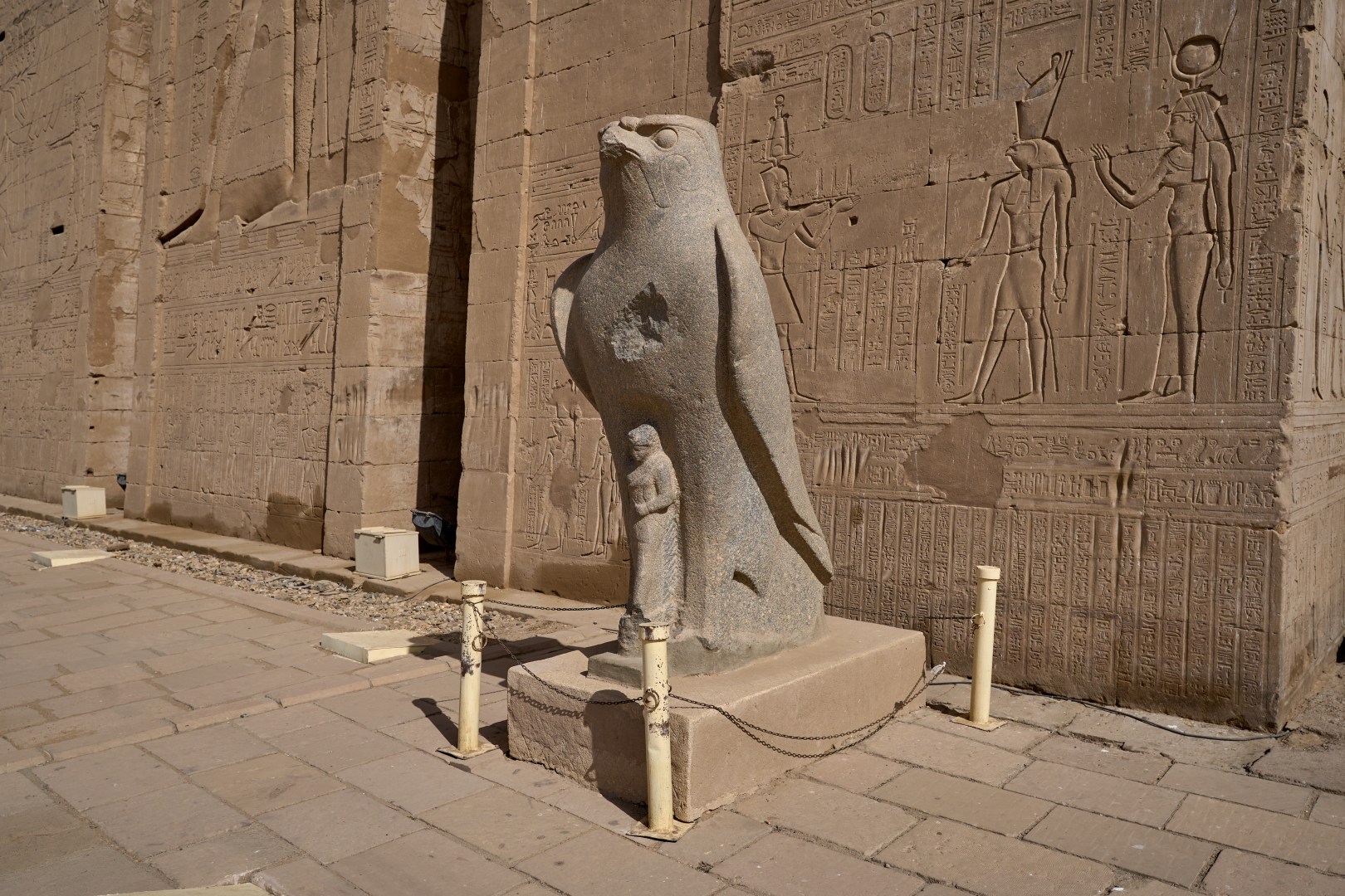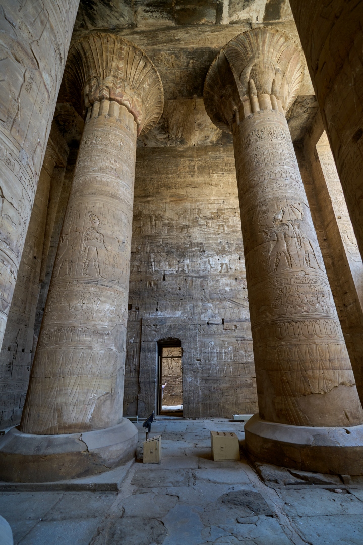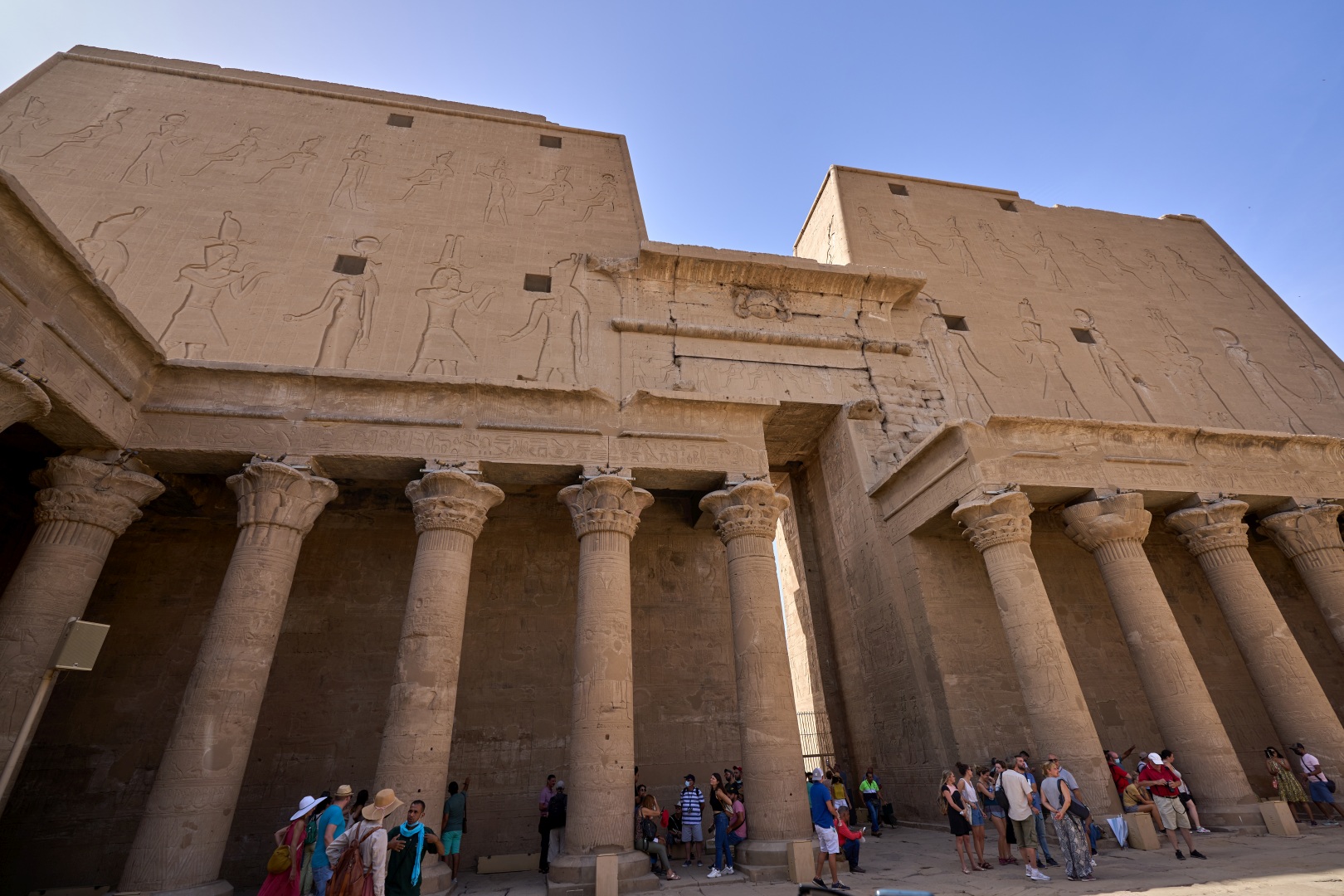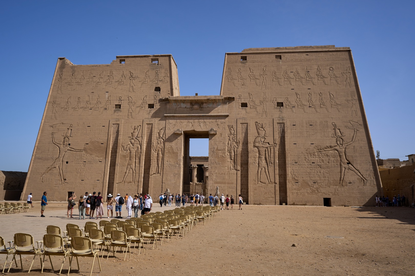 На пилоне можно видеть изображения Птоломея XII (правил в 80 — 51 годах до н. э.) казнящего своих врагов перед Гором.
