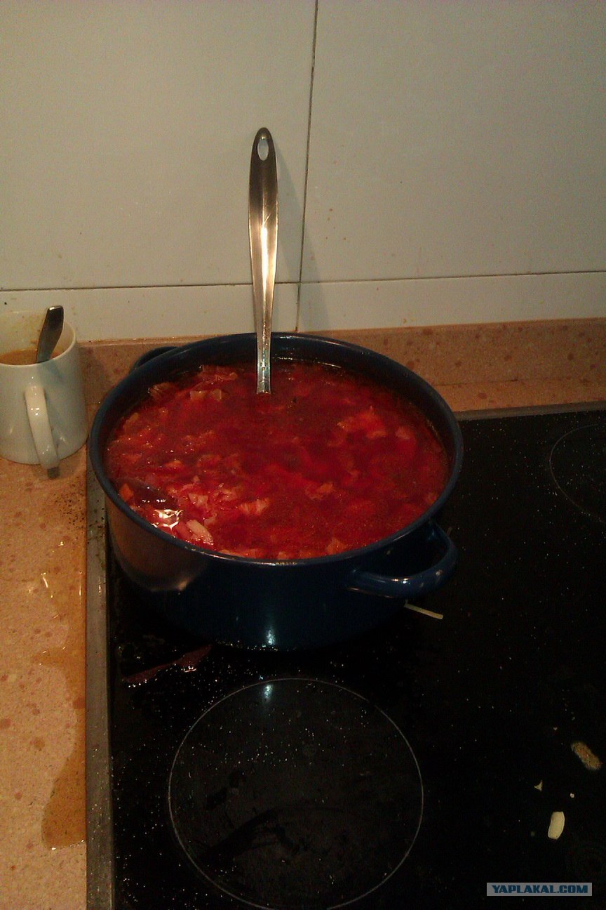 готовить пришлось несколько раз... вот, например, борщ... ах, как он зашел под водочку... они водку пить не умеют, поэтому смотрели, как мы с двумя ребятами (пара из Питера) заливаем по 50 гм не закусывая и завистливо качали головами :-))