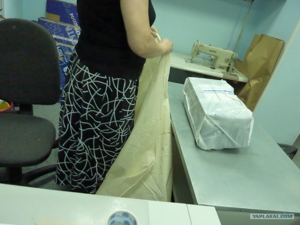 ...Она измеряет коробку, отрезает большой кусок ткани, чтобы обшить коробку с помощью швейной машины, делает сумку....