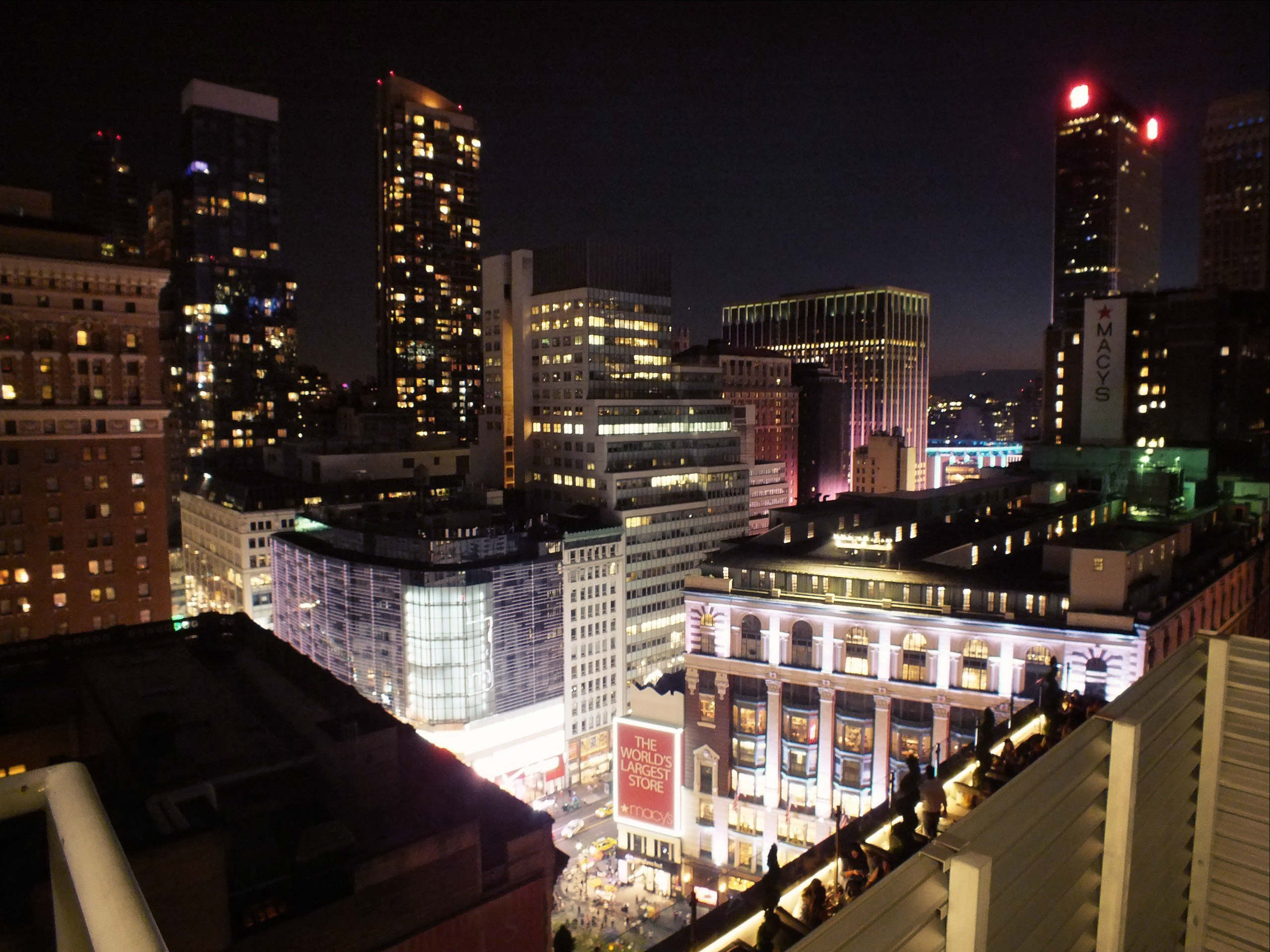 Уже ночью, исследуя гостиницу, мы добрались до последнего этажа, а позже обнаружили, что все двери, ведущие на крышу, открыты (насколько мне стало известно, после события с башнями близнецами крыши всех небоскребов остаются открытыми). Любопытство взяло верх, и мы последовали за ним, к тому же никаких запрещающих знаков или указателей не было. Правда, на следующий день, когда мы снова решили насладиться видом с крыши, через некоторое время там появился полицейский, который сообщил, что не нужно сюда ходить, так как это опасно для жизни.