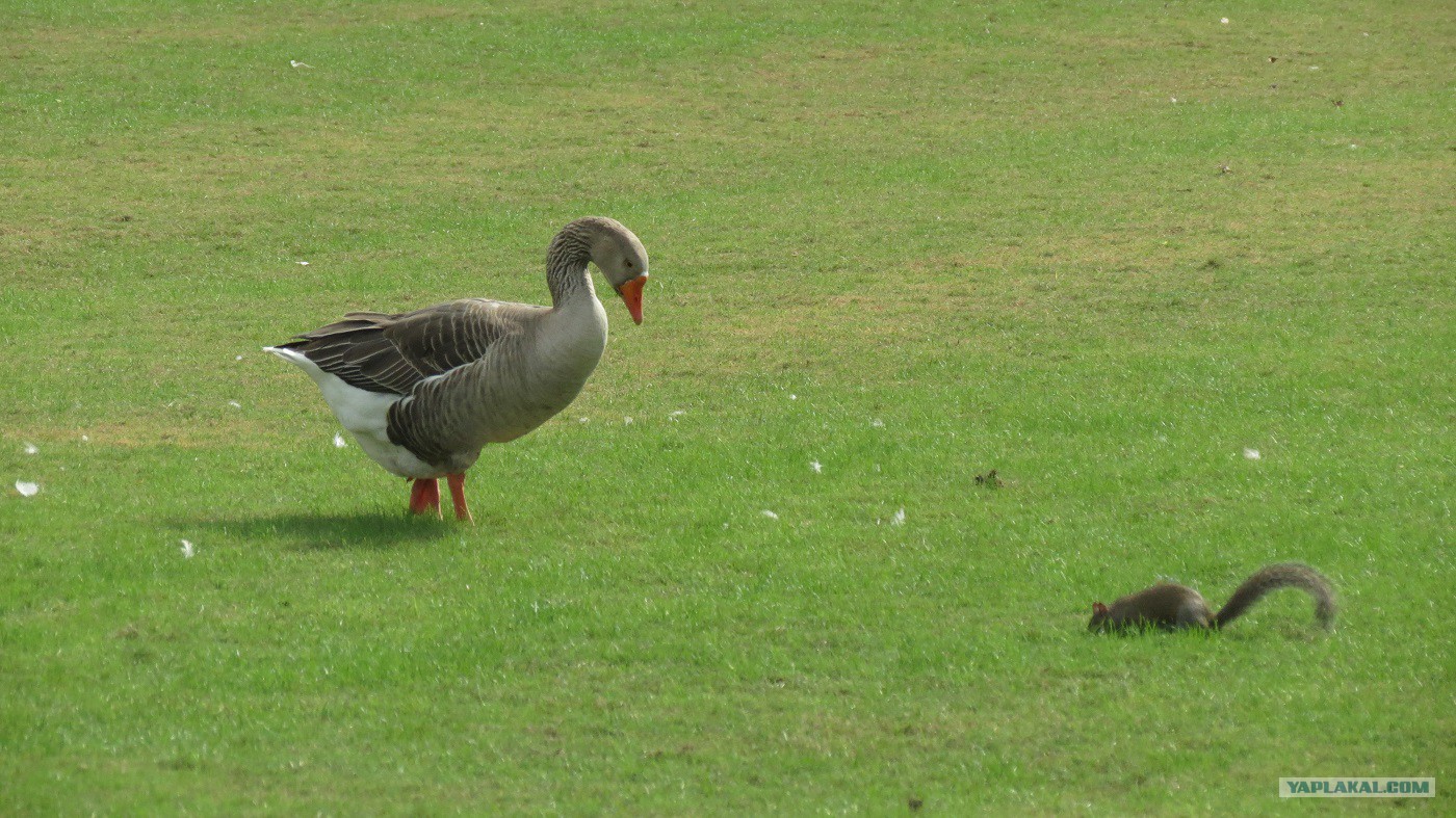 Упитанные гуси я так тоже думаю дикие мирно соседствуют с бомжами которые на лужайке спят и не охотятся на гусей.