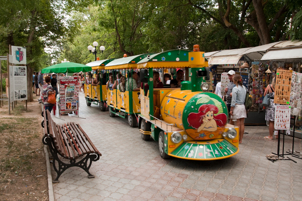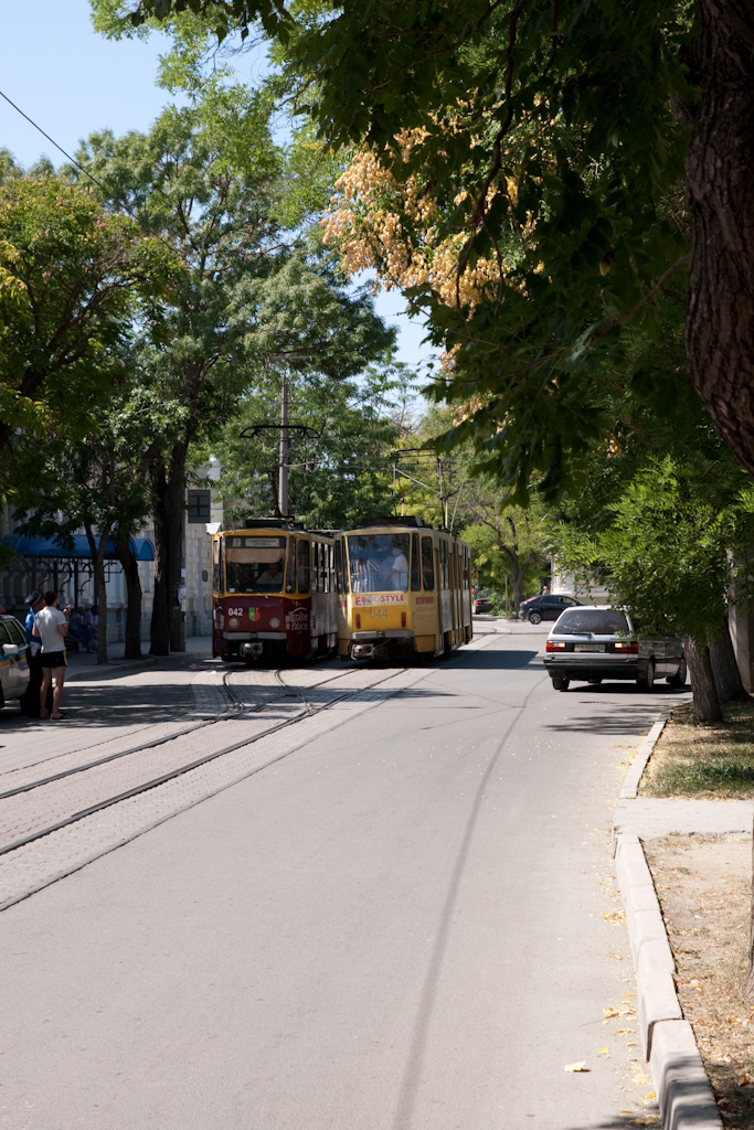 Самое интересное что по городу проложена только одна линия рельс, а трамваи разъезжаются на остановках.