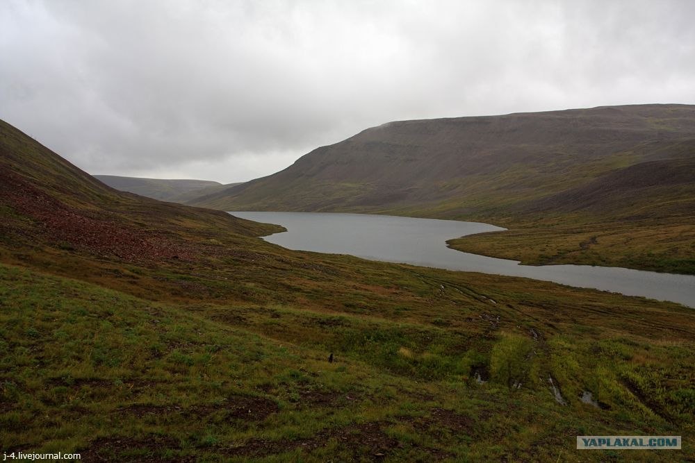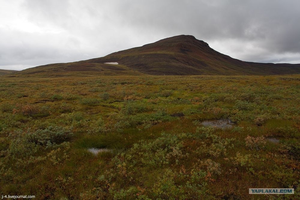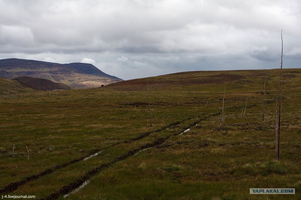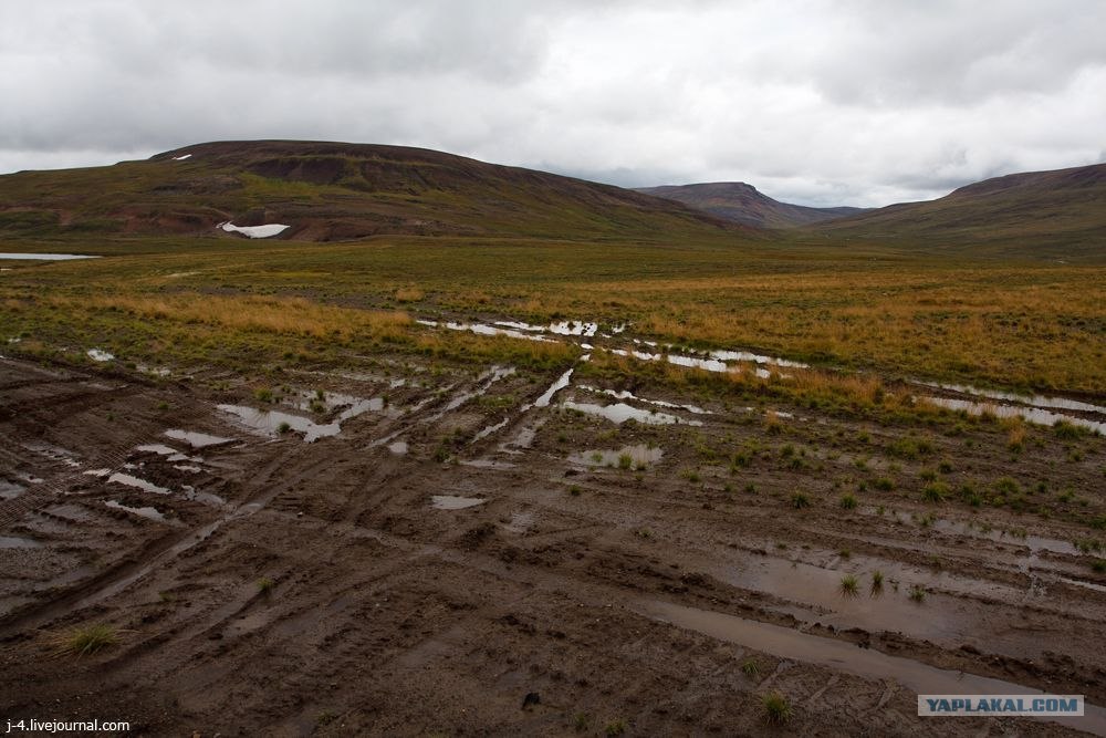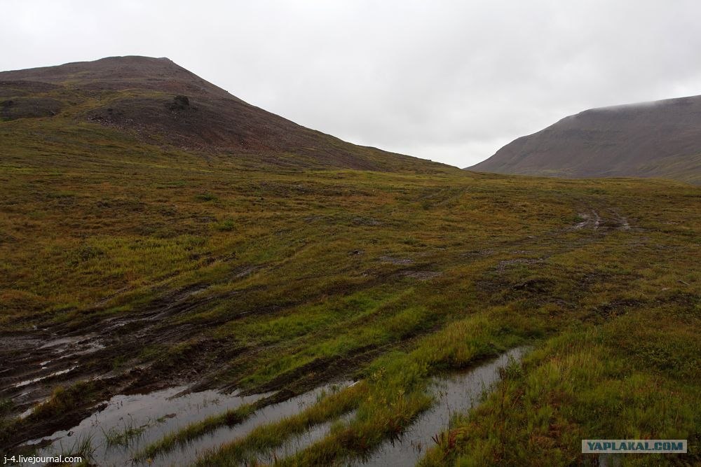 Крутой подъем в гору, почти как крымские серпантины, спуск, съезд с дороги, и вот она - тундра. Начался девятичасовой маршрут по тропинкам, дорогам, колеям, болотам, ручьям, грязи и прочим интересным поверхностям, вниз и вверх.