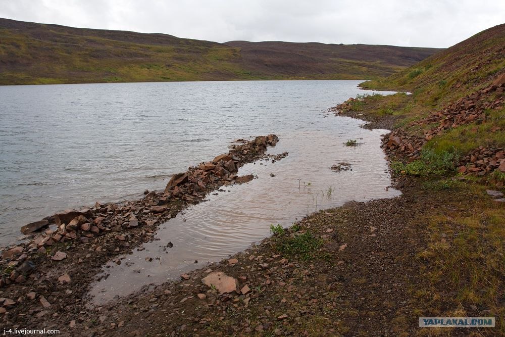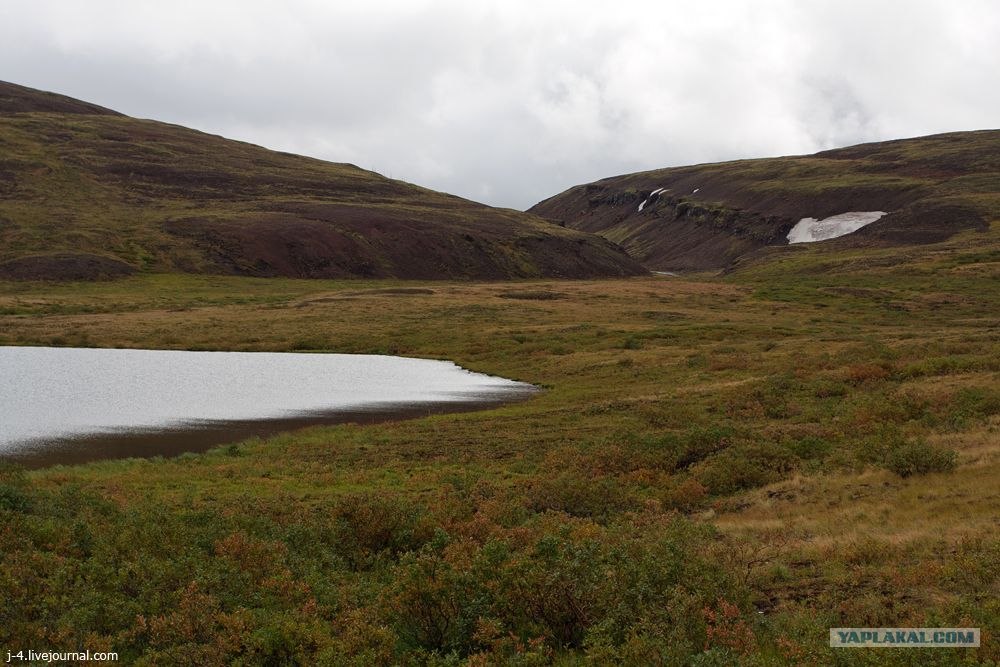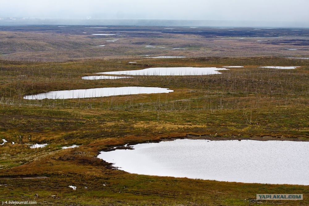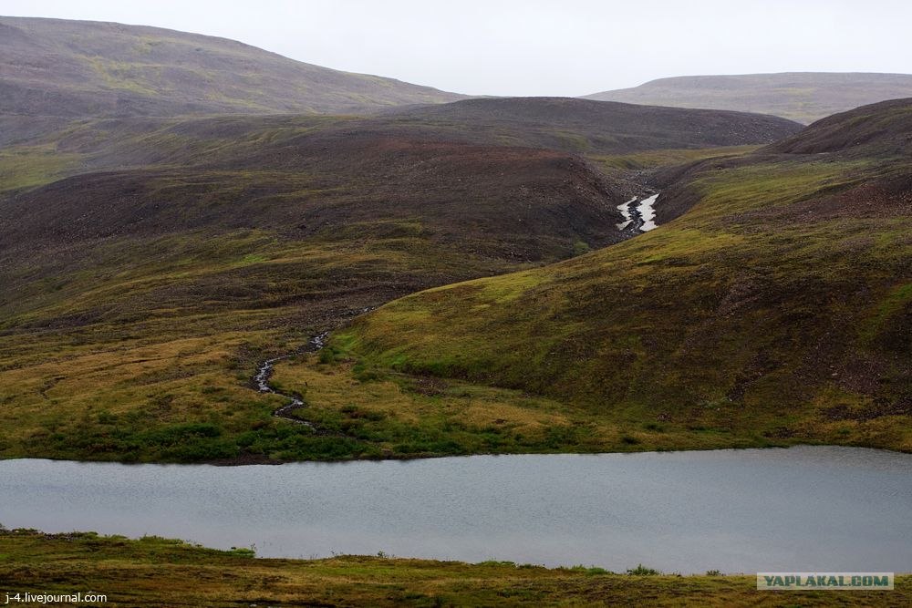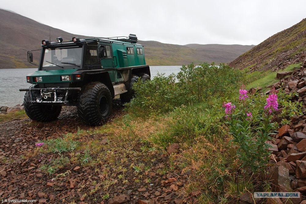 Крутой подъем в гору, почти как крымские серпантины, спуск, съезд с дороги, и вот она - тундра. Начался девятичасовой маршрут по тропинкам, дорогам, колеям, болотам, ручьям, грязи и прочим интересным поверхностям, вниз и вверх.