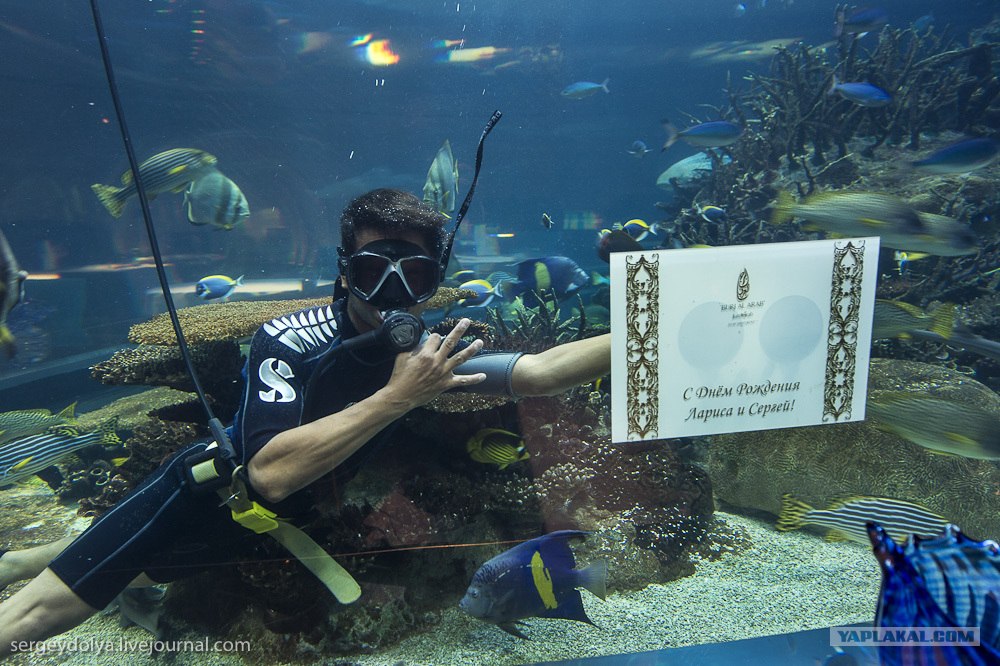 На самом деле, он просто отвлекал наше внимание, потому что когда мы повернулись обратно к аквариуму, то увидели водолаза, который держал табличку на русском языке с поздравлениями нас с Днем Рождения! Это было очень неожиданно и круто! Нам потом рассказали, что обычно с помощью этого водолаза в Бурдж Аль Араб делают предложения: