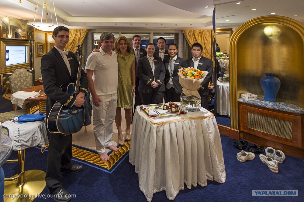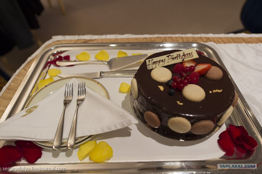 Вернулись в номер и стали собираться в Дубаи Молл за подарками - я уже писал, что как лошара, не успел купить жене подарок заранее. Перед выходом в дверь постучали, а за ней оказались 7 дворецких с тортом и гитарой: