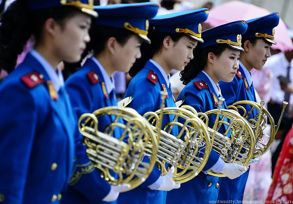 26.Музыканты женского оркестра Министерства железных дорог КНДР были одеты в плотные костюмы, но виду, что им тяжело, не подавали
