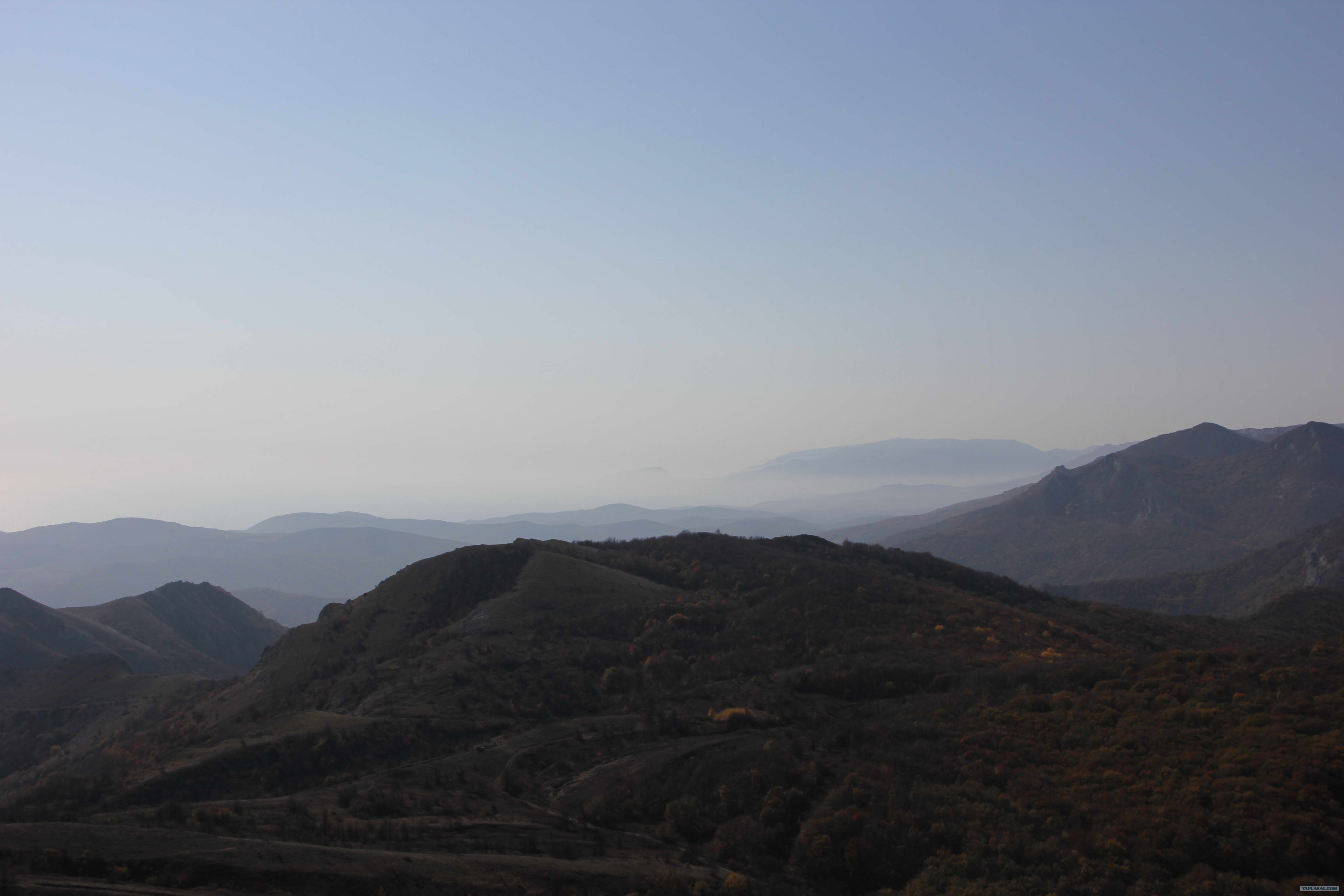 А вот еще фото - конец октября, Зеленогорье (кто-то писал). Прямо по курсу - Ай-Петри (угадывается), правее Аю-Даг, над морем дымка. ПыСы: Фото коллеги.
