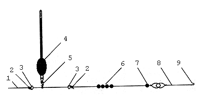 1- леска; 2- стопорный узел; 3- бусинка; 4- поплавок; 5- застежка; 6- огрузка; 7- подпасок; 8- поводок; 9- крючок