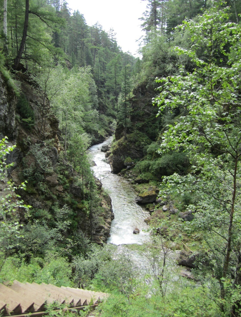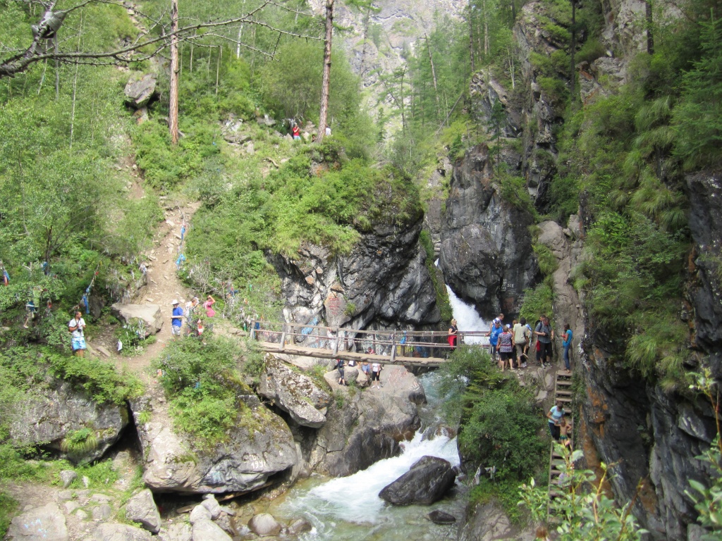 72. В первую очередь полез в горы. К минеральным источникам у подножья вход свободный, а вот повыше стоит будка, и ребята берут с туристов по 50р на благоустройство. Может это и обдираловка в стиле О.Бендера, но дают билетик, да и тропинки до первого водопада действительно кто-то поддерживает в адекватном состоянии, установлены перила, лестницы, бронзовый медведь. Дальше идут не все, поскольку местами тропа весьма не простая. Я и сам не стал заходить далеко, прошел несколько водопадов (как оказалось после; я бы этих малюток так не назвал), искупался, где было поглубже, и вернулся к подножью.