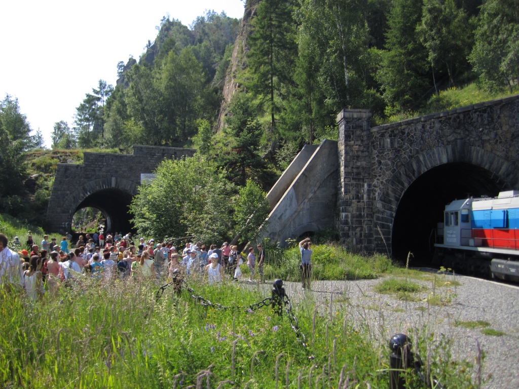 68. Кругобайка́льская желе́зная доро́га (КБЖД) — название, использовавшееся во время постройки и первых годов эксплуатации по отношению к участку Забайкальской железной дороги от станции Байкал до станции Мысовая протяжённостью 260 километров (ныне этот участок входит в состав Восточно-Сибирской железной дороги).В настоящее время Кругобайкальской железной дорогой обычно называют ветку длиной 89 километров Слюдянка II — Култук — Маритуй — Байкал. На КБЖД используется 38 тоннелей общей длиной 9063 м (самый длинный из них — тоннель через мыс Половинный длиной 777,5 м), 15 каменных галерей общей длиной 295 м (сейчас используется только 5 из них) и 3 железобетонных галереи с отверстиями, 248 мостов и виадуков, 268 подпорных стенок. По насыщенности инженерными сооружениями КБЖД не имеет равных в России и занимает одно из первых мест в мире. Тоннели и каменные галереи Кругобайкальской железной дороги уникальны тем, что они строились по нетиповым проектам и не были перестроены в последующие годы, сохранив первоначальный замысел архитекторов и инженеров начала XX века.