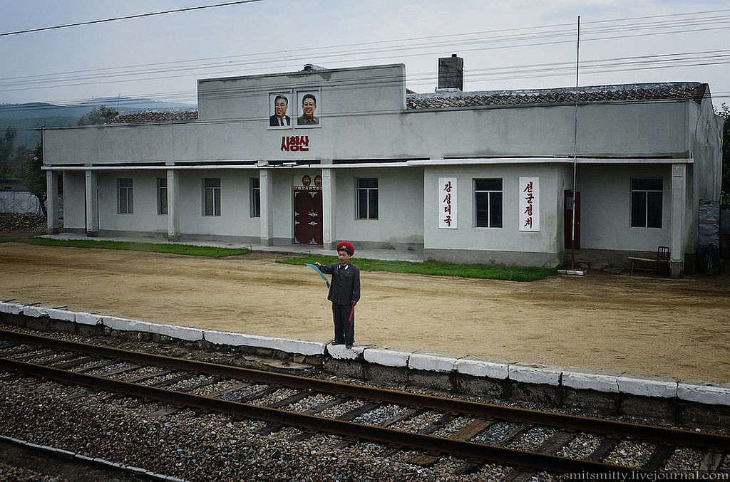 52.Проезжаем ЖД станции. На каждой портреты великих вождей Ким Ир Сена и Ким Чен Ира