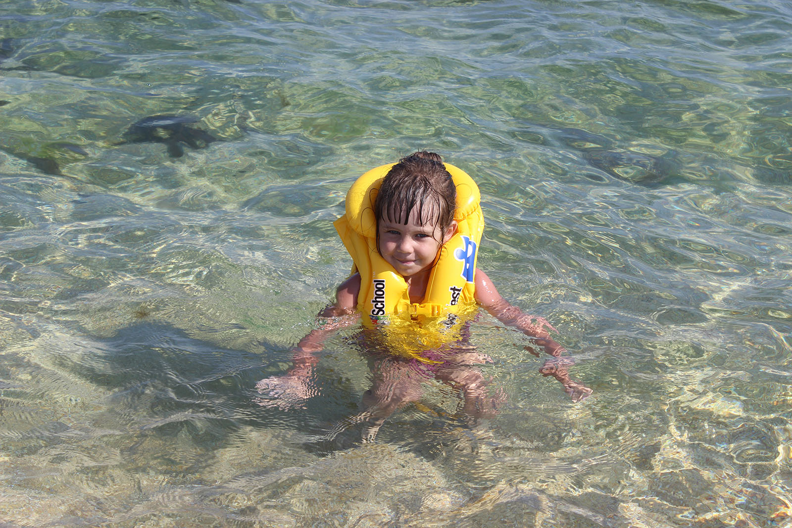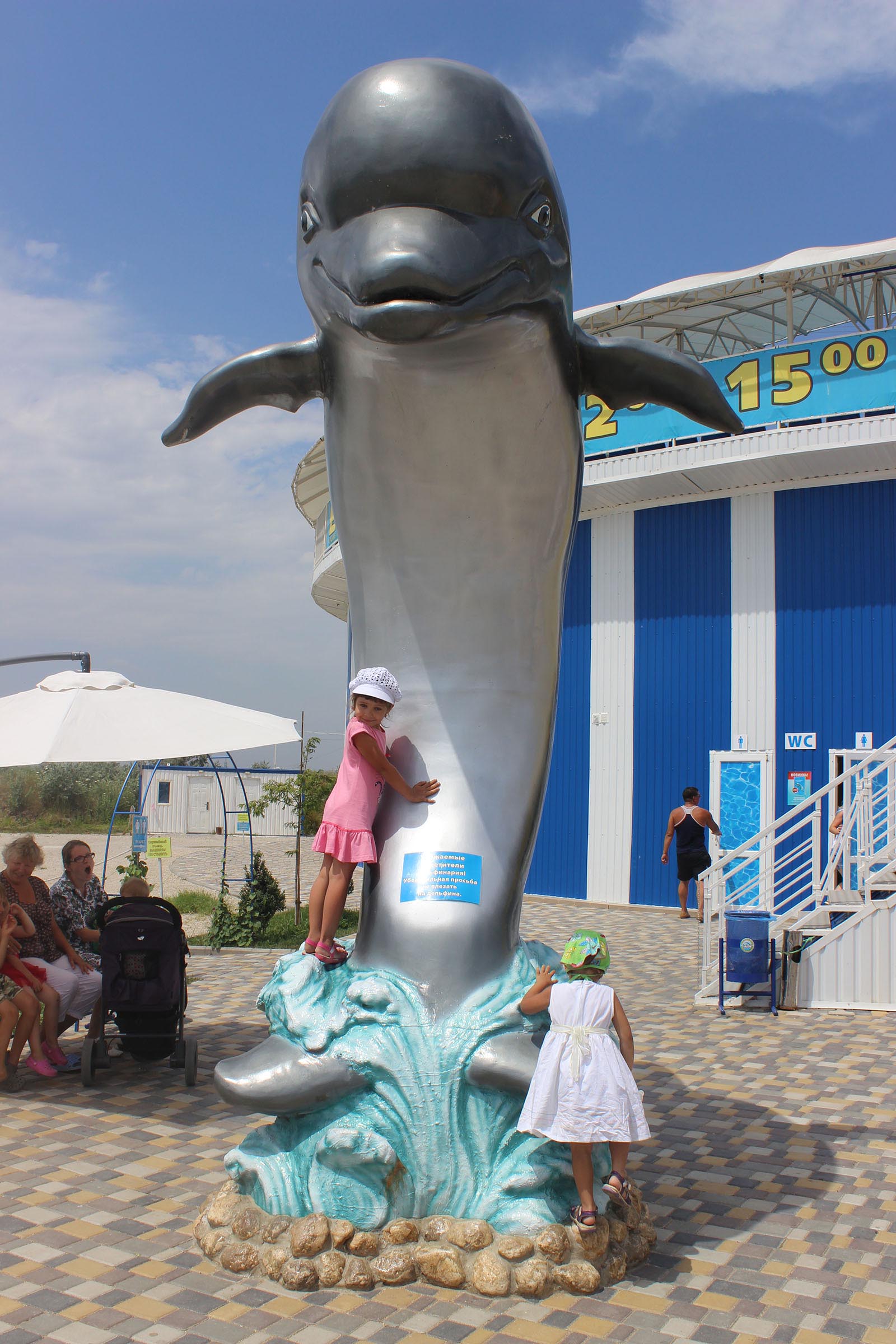 Посмотрев рыбин и гадов, щёлкаемся у дельфина и бегом на пляж.