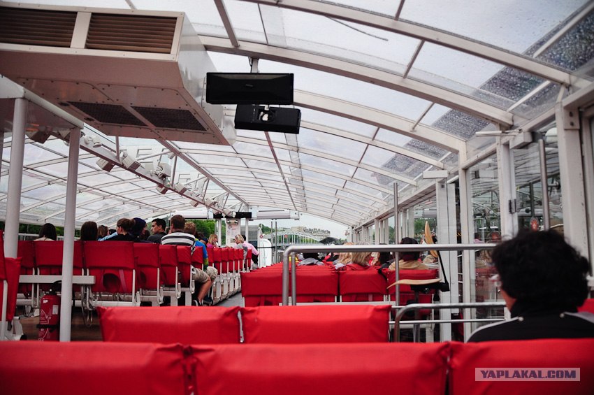 67. Прошли мы до пристани и поехали кататься на кораблике по Сене, на улице дождик, поэтому сидели внутри и пытались согреться