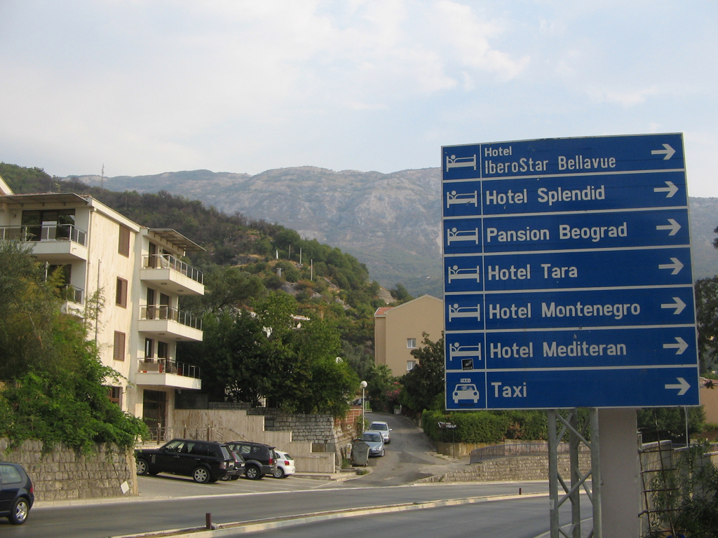 На следующий день решили поехать на остров святого Стэфана, но сначала дойти пешком до Бечичей, по пути куча указателей на отели.