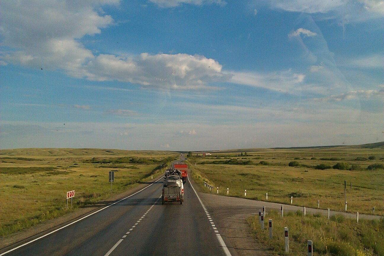 Казахстан — это бескрайние степи. Практически весь Казахстан получилось проехать на 2х фурах. За сутки пути на грузовике можно проехать порядка 1000км. Дороги по сравнению с Россией плохие, ограничение скорости для грузовиков — всего 70 км/час. Траффик гораздо реже, чем в России. Зачастую до горизонта дорога не имеет никаких поворотов, то и дело путь преграждают стада лошадей или верблюдов. Цены на все примерно российские.