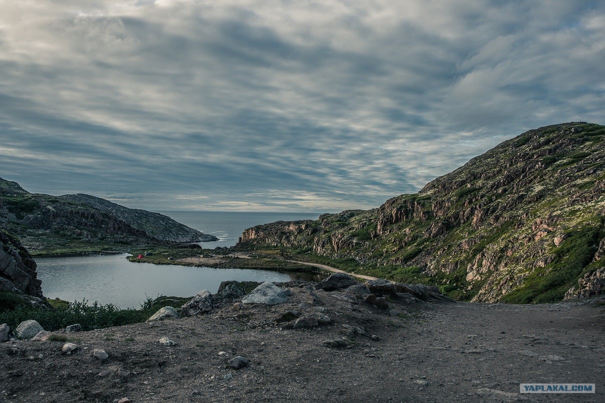 Разузнали что еще есть водопад и арт батарея которая перекрывала залив во время войны, тут не далеко со слов местных. Поехали. Ну да, и правда не долго, ехали минут 20 на машине. Справа море, слева озера. Народ базируется в палатках группками, но не много, думаю машин 30-50 всего на весьма обширную территорию включая гостиницы, поселок, палатки. Доехали куда могли, поняв что дальше не суются даже джипы, мы оставили машину и пошли пешком. Шли еще минут 15 наверное. Вообще местность каменная, и на дороге застрять сложно, главное днище валунами не пробить но проехали на легковой.