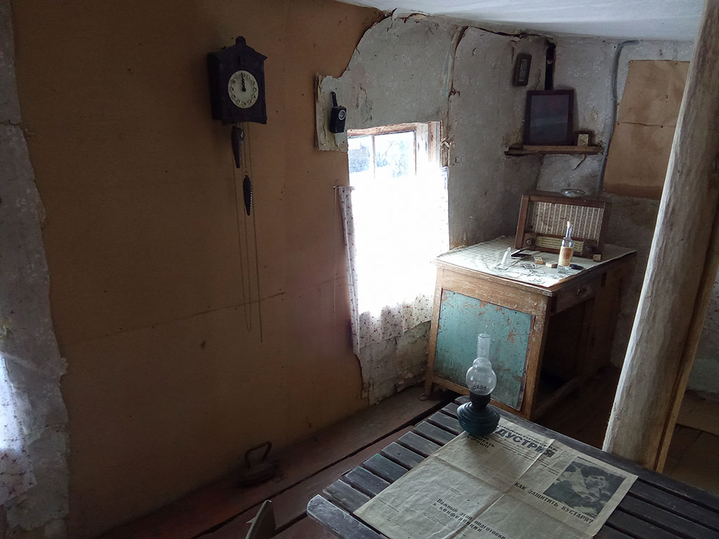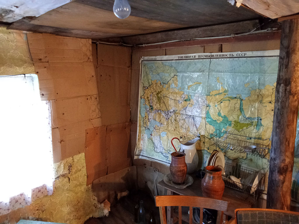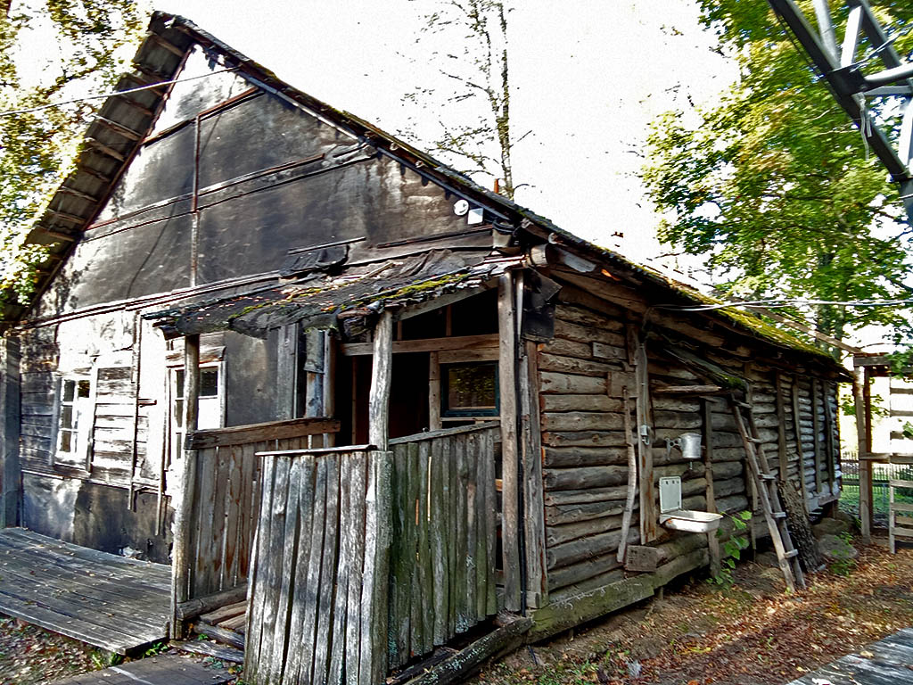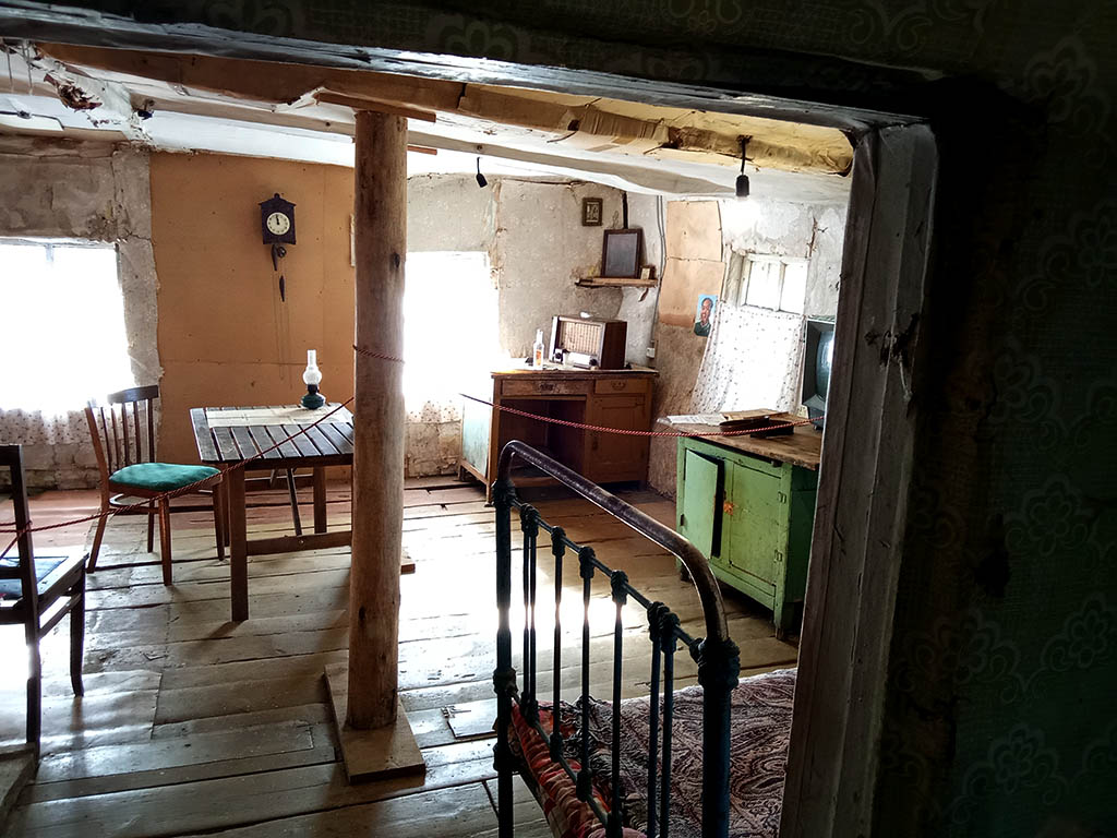 Ну, как сохранился... Дело в том, что его нельзя реставрировать: он в культурно-научных целях должен оставаться именно в таком виде. "Дом Михал Иваныча производил страшное впечатление". И чинить нельзя, но и оставлять гнить тоже не вариант. Хорошая задачка для инженеров-реставраторов (вторая задачка - за чей счёт это делать). Пока только балки железные поставили, чтобы дом хотя бы не упал.