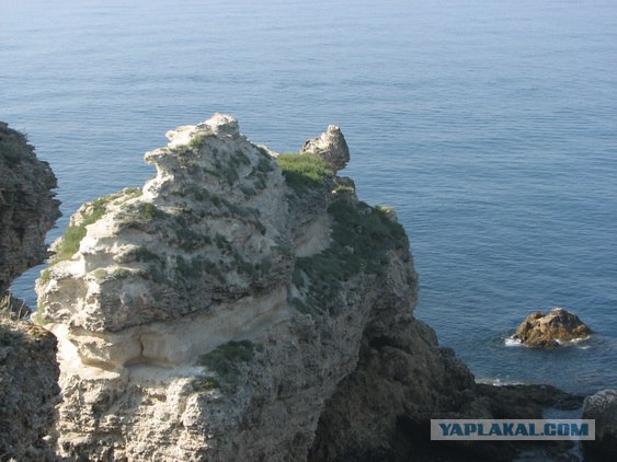 Хочу Вам рассказать о моей поездке на Тарханкут (просьба не ломать). На мыс Тарханкут можно попасть разными способами, я добирался от Евпатории, расстояние 110 км или примерно 2-2,5 часов пути, сразу хочу предупредить, что дорога очень плохая. Последним населенным пунктом перед Тарханкутом является село Оленевка, так что мой совет остановиться и затариться водой и продуктами, так как на самом мысе только четыре палатки, в которых соответствующие цены. Также мой совет взять с собой головные уборы, зонтики, палатки, так как это место является одним из самых жарких в Крыму. При выезде с Оленевки вас встречает Тарханкутское бездорожье, скорость передвижения очень невысокая. Сначала Вы въезжаете на территорию Большого Атлеша (первая часть Тарханкута). При въезде Вы видите маяк (к сожалению фото нет) и действующую военную часть ПВО. Дальше проехав пару километров Вы видите Мыс Черепашка или Мыс Екатерины или просто Катька.