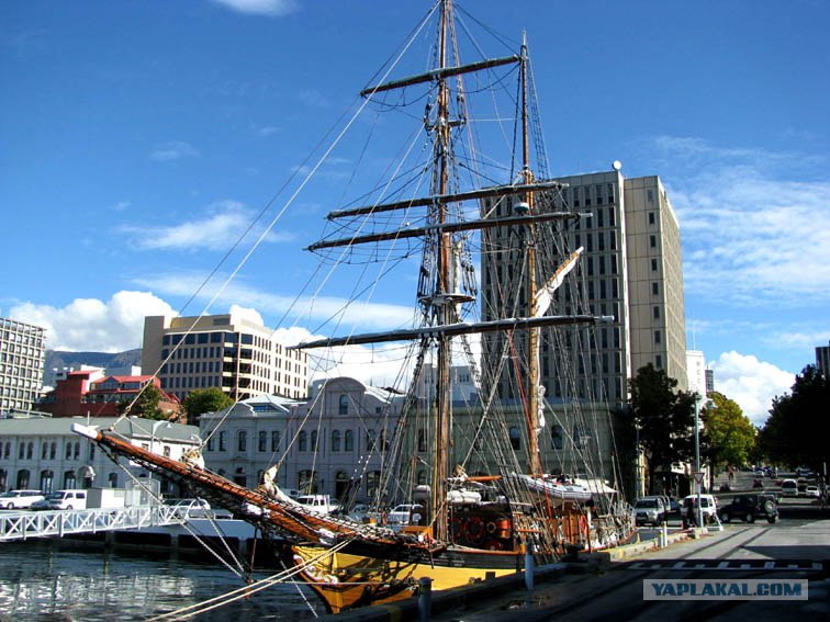 Это Хобарт -столица Тасмании. Когда я на набережной стоял и любовался корабликом рядом стояла парочка - бабушка и дедушка. Я говорю - красивый корабль, не правда ли ! А они мне отвечают - А вы знаете, молодой человек, когда англичане приплыли сюда впервые на этих "красивых" кораблях то они убивали всех без разбора - мужчин, женщин, детей. Просто истребляли аборигенов начисто ! Я удивился - "Ну как же, они ведь вроде бы просто исследовали новые земли, то есть были исследователями, но не убийцами !" Тогда парочка рассмеялась и бабушка сказала что все это ерунда и первые поселенцы были самыми настоящими засранцами.