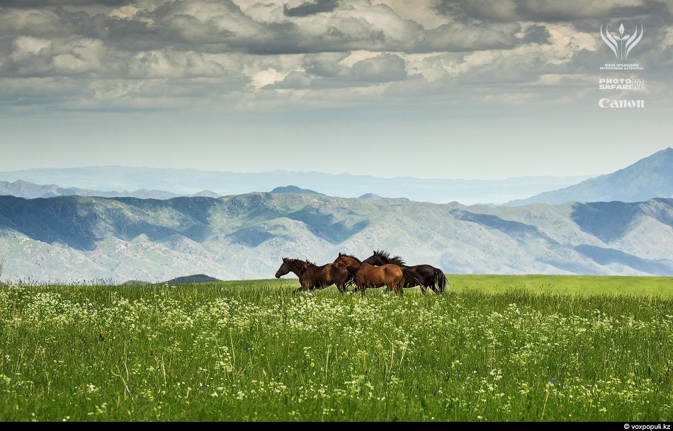 На фоне мягких изгибов холмов Табан-Карагая мирно бродят благородные кони