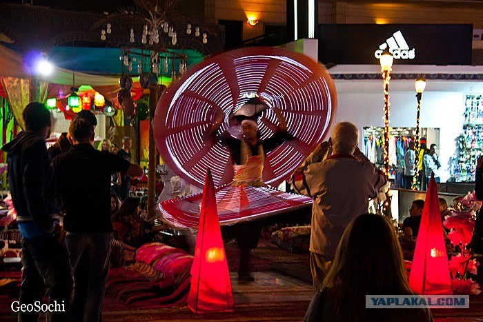 В выходящих прямо к пешеходной улице кафешках гремит музыка, огромные светящиеся юбки крутятся в танце.