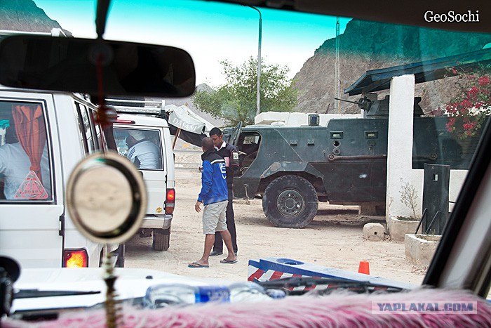 Военизированный пост неподалёку от города Нувейба преграждает путь вглубь Синайского полуострова. Если вам скажут, что формально, для путешествия по Синаю виза не нужна, то это не так — визу проверяли постоянно.