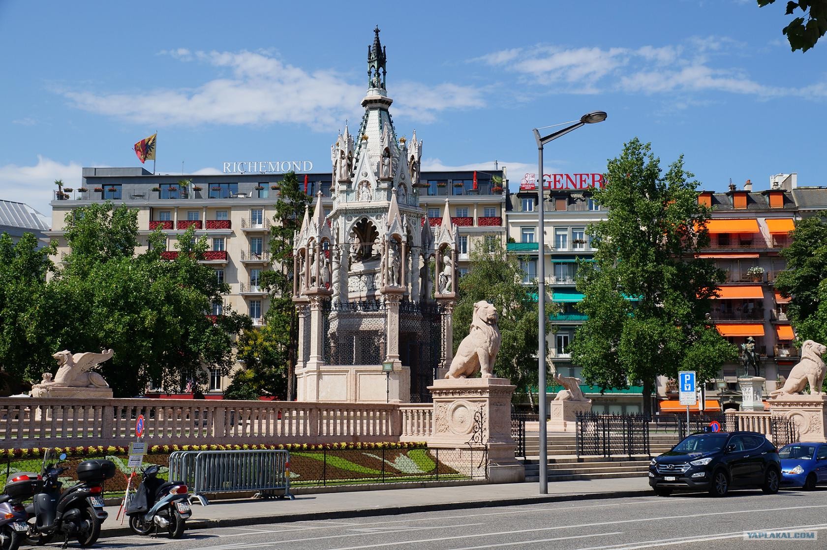 Гробница-мавзолей германского герцога Брауншвейгского, изгнанного из своих владений и умершего в Женеве в 1883 году. Он завещал городу огромную по тем временам сумму в 22 миллиона золотых франков, но при условии, что в память о нем воздвигнут мавзолей и будут за ним ухаживать. Герцог был отъявленным распутником и непорядочным человеком. Условие было из ряда вон выходящим. Но миллионы... И муниципалитет не смог устоять перед силой денег. За памятником ухаживают и по сей день.