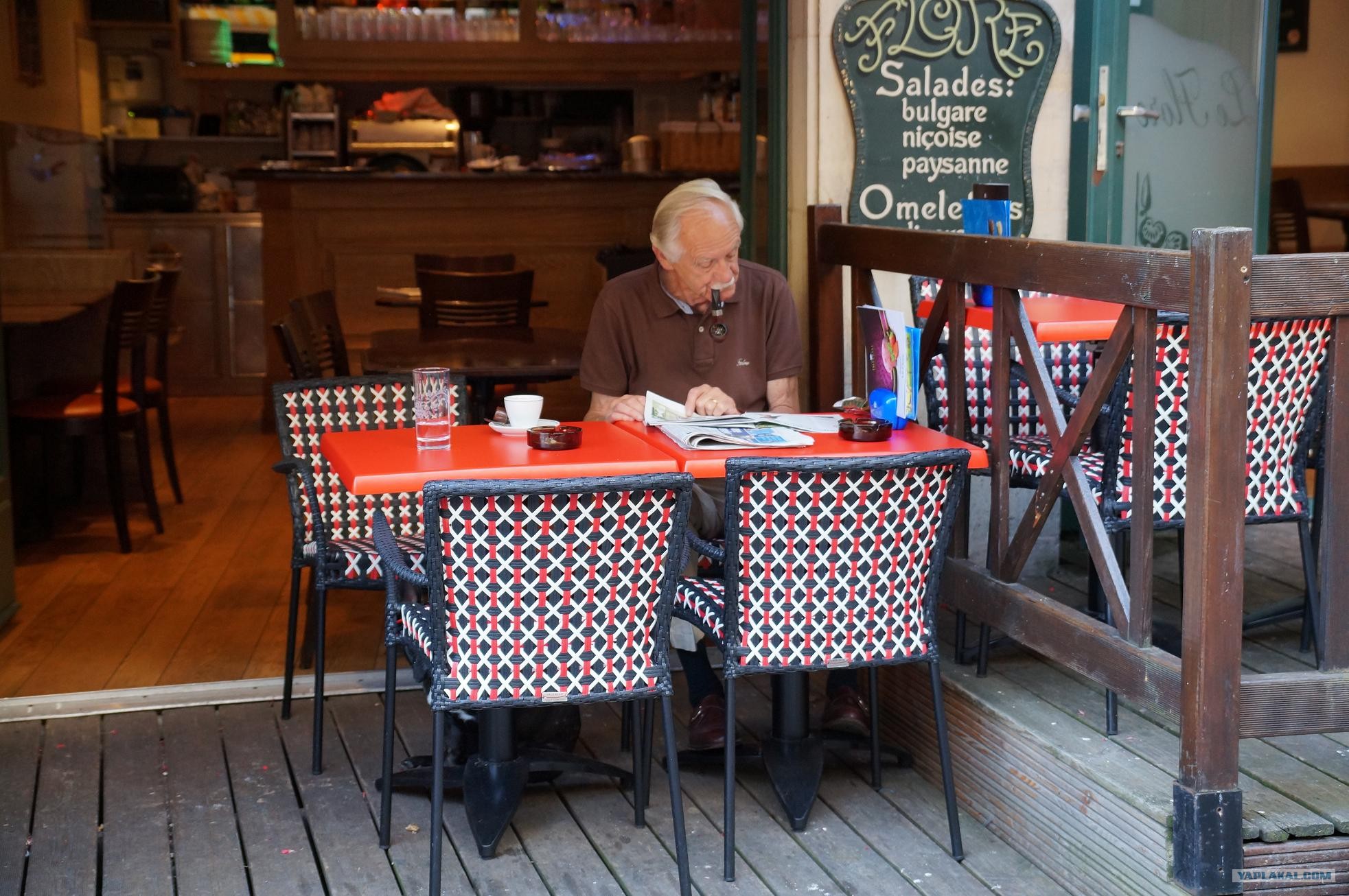Местный пенсионер читает прессу в кафе