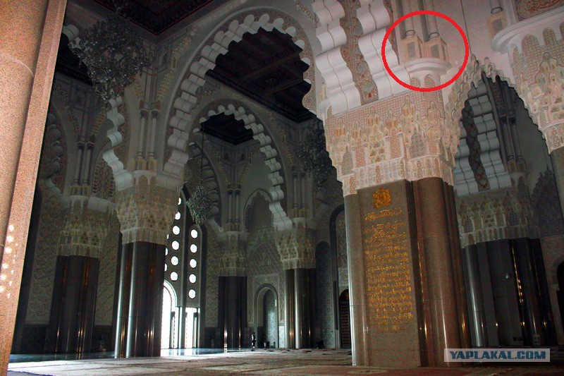 Мечеть вмещает около 20.000 молящихся и имеет много технических новшеств от полов с подогревом до раздвижного потолка. А вот, обратите внимание, замаскированные «колонки в колоне», которые служат громкоговорителями.
