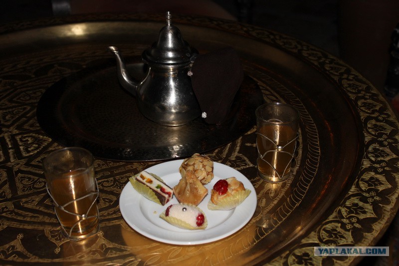 Фирменные марокканские блюда, приготовленные в таджине (керамический горшок особой формы). Мясо и овощи. Средняя стоимость – 50-70 дирхам. На улице свежо – около 18 градусов тепла.