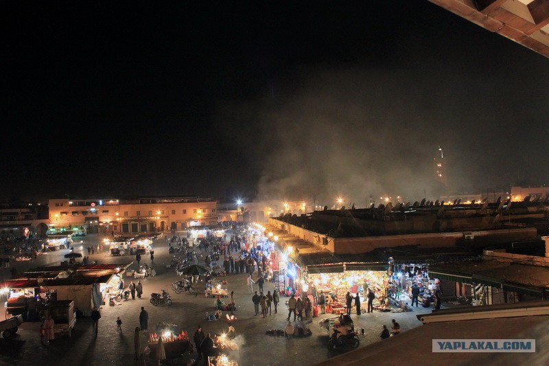 А вот и вид из ресторанчика на Джама Эль-Фна, главную площадь. Дымка, которую вы видите над площадью, образовалась из-за местных кулинаров, которые на мангалах варят похлебки и жарят мясо. Здесь же можно и поесть, посидев за большими деревянными столами. Мы пробовали острых улиток – весьма сомнительное кушанье.