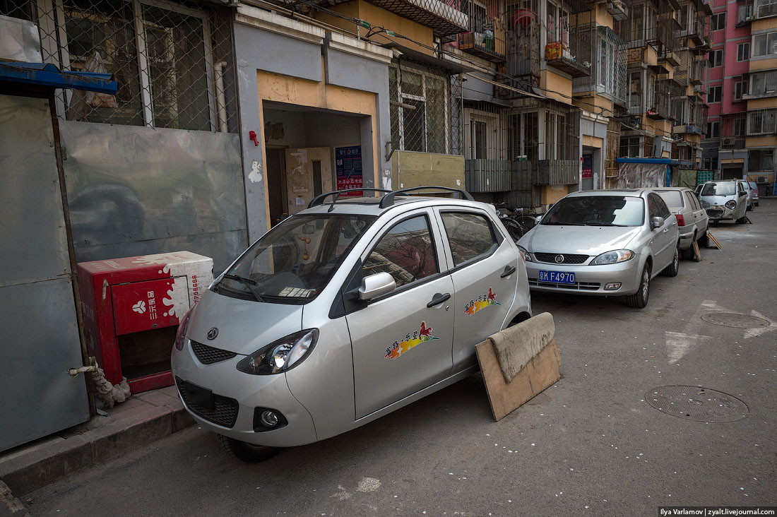 Довольно популярная китайская машинка - мопедомобиль какой-то. Во дворе хозяин приковывает свою машинку к столбу на замок.