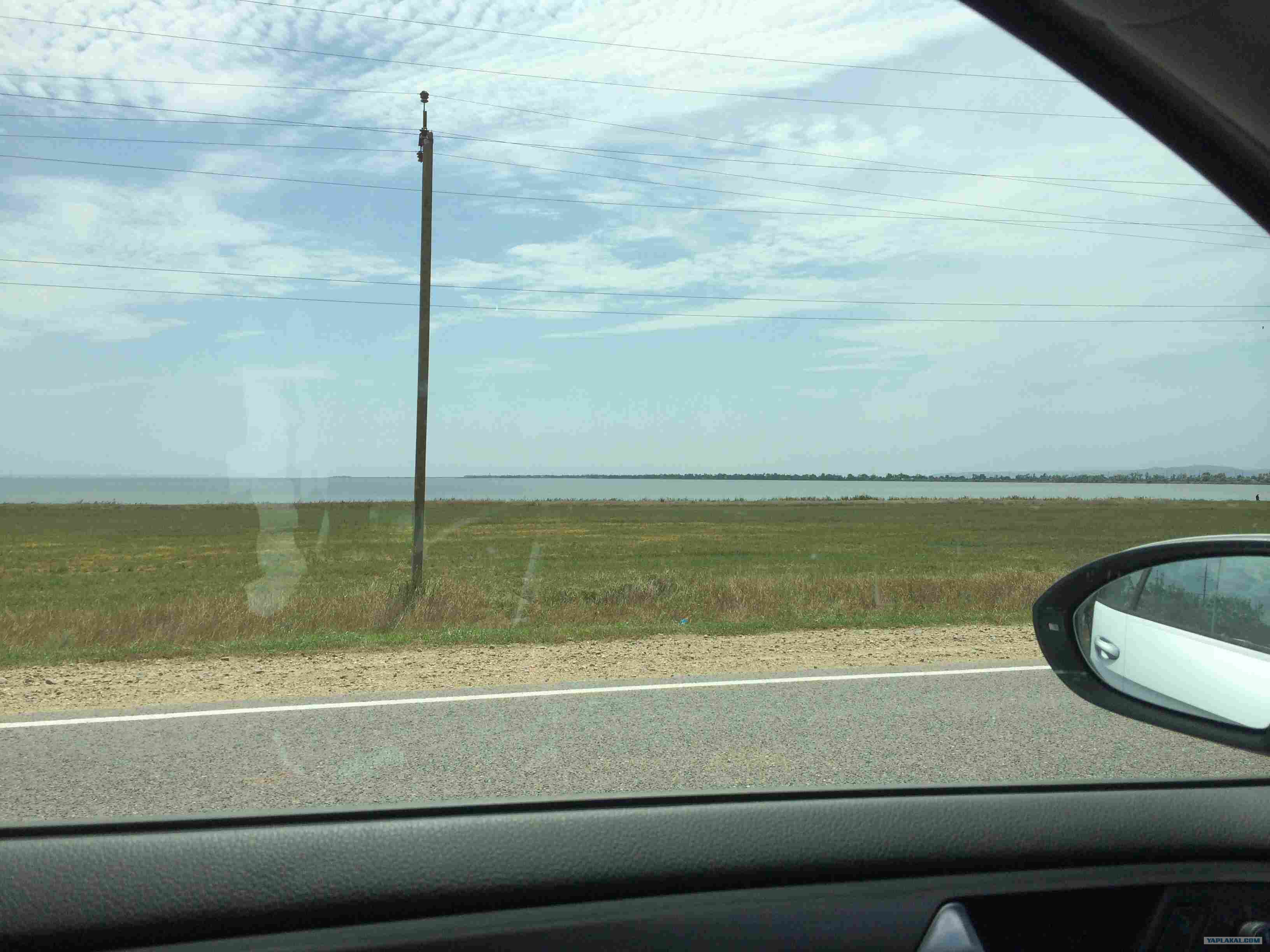 2. По дороге особо не фоткались - девченки не хотели снимать, а мы заняты были - следили за радар детектором и скоростью) Первая фотка - от подъезда к паромной переправе в Порт Кавказ. Тогда мы не знали, что нам придется стоять в пробке аж 31(!!!) час. На конце этого мыса стоят паромы - пробка 12 километров