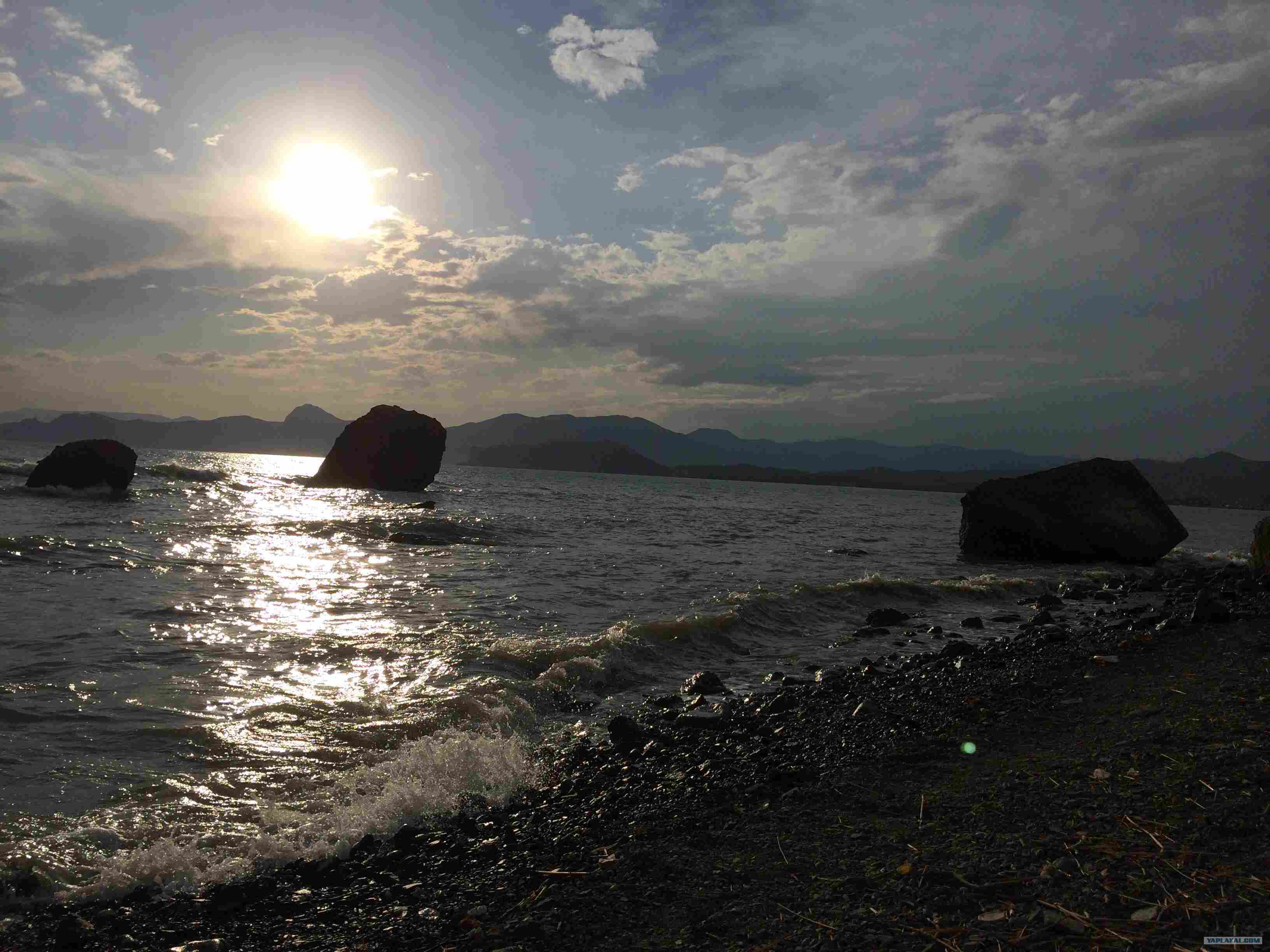 17. Далее в программе была запланирована встреча заката на мысе Меганом. По незнанию сунулись на нашей пузотерочке на верх мыса по дороге только для подготовленных машин. Я продержался балансируя между колеями и отвесными обрывами километра 2 вверх, но увидев подъем по гальке градусов в 30 мой пыл пропал и мы спустились вниз, оставив машинку на стоянке и пройдя вдоль берега пешком.