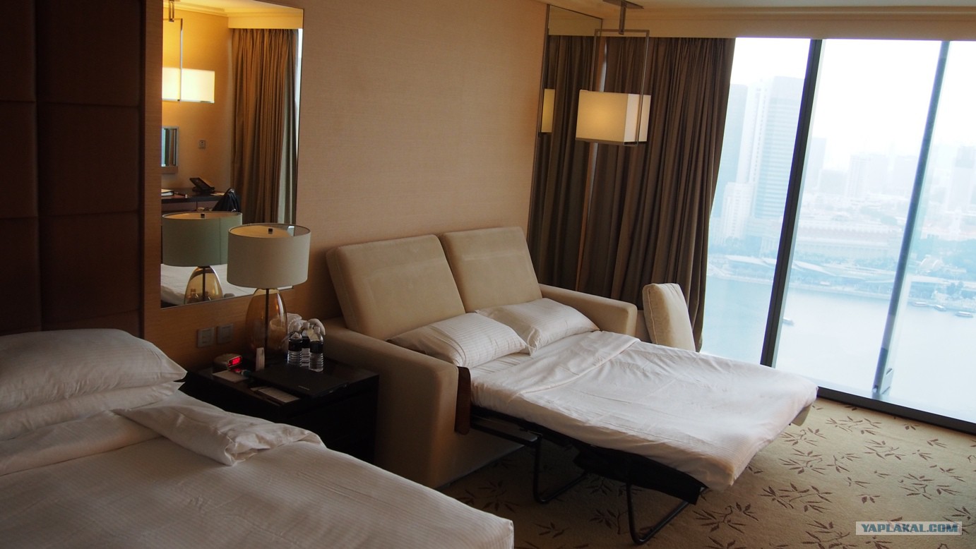 Приехали в 7 утра убитые после 11 часового перелета. Нам сказали, что номер с видом на сад на 22 этаже будет готов к 11 утра, а с видом на город на 37 этаже к 9 утра, но за него нужно доплатить по 58 сингапурских доллара в сутки, это где-то 46 американских. Ну, типа за супер-вид и за раннее заселение. Маленький развод, конечно, на фоне нашей усталости, но в принципе, мы не пожалели. А пока нам предложили посетить бассейно до готовности номера. Ну а нам какой бассейн. Только впечатления портить. Провалялись 2 часа на ресепшене. И вот, наконец-то, дали ключи от номера в полдевятого. Итак, шо мы имеем за эти деньги. Ну, в первую очередь вид.