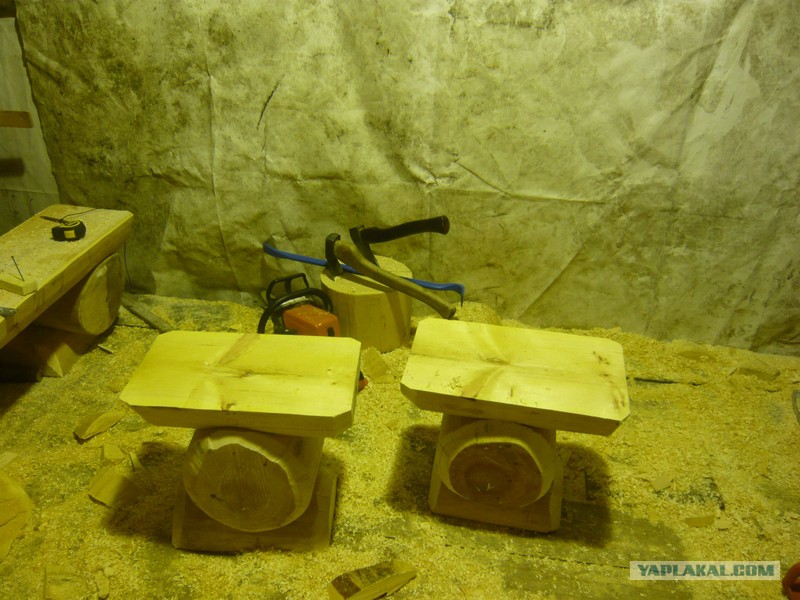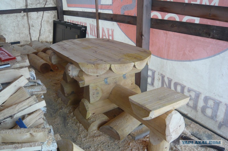 Молодцы конечно! Но имхо садовая мебель из кругляка – это очень на любителя. Ее ж потом с места не сдвинуть. Смотрится на мой взгляд тоже не очень.