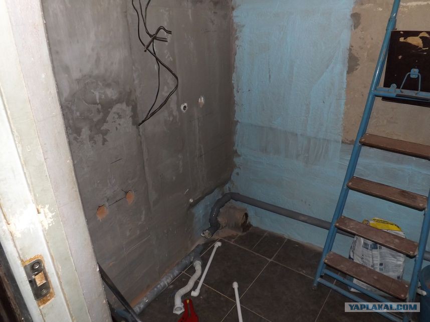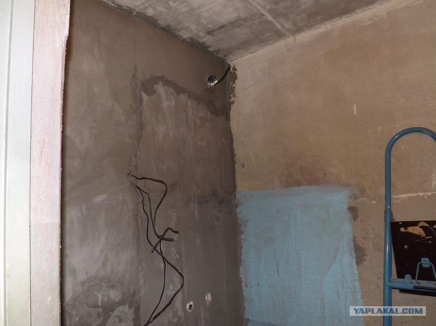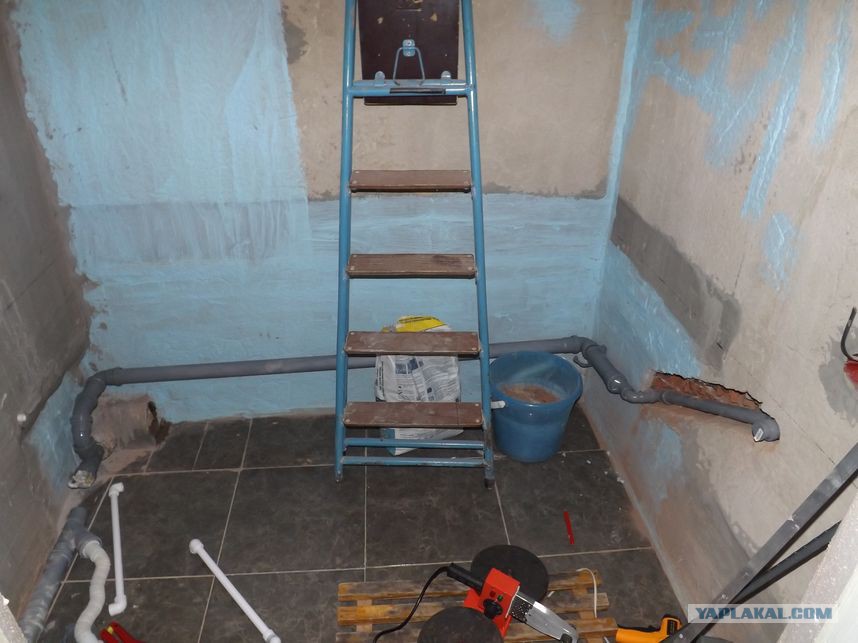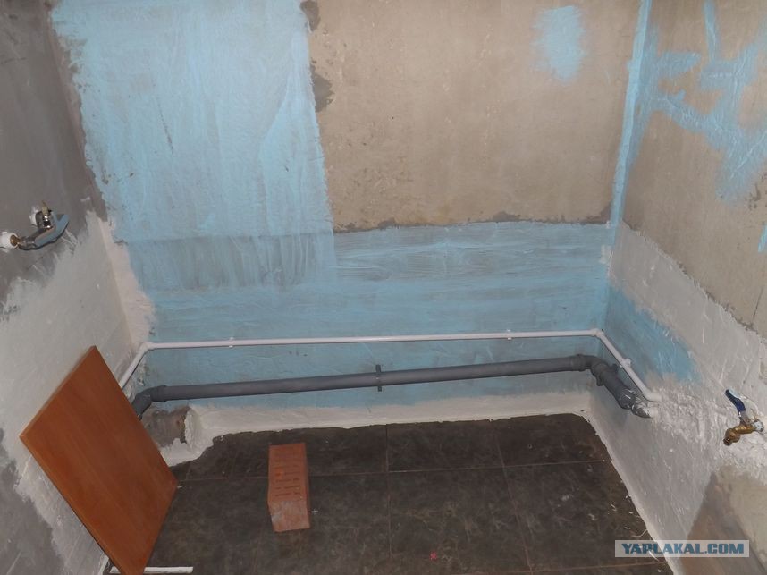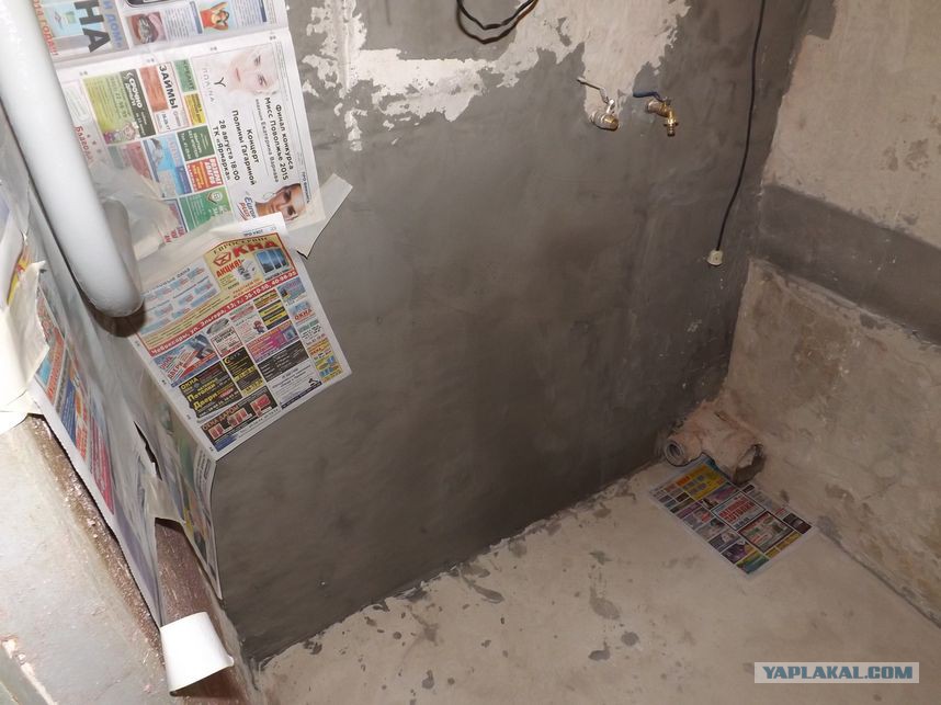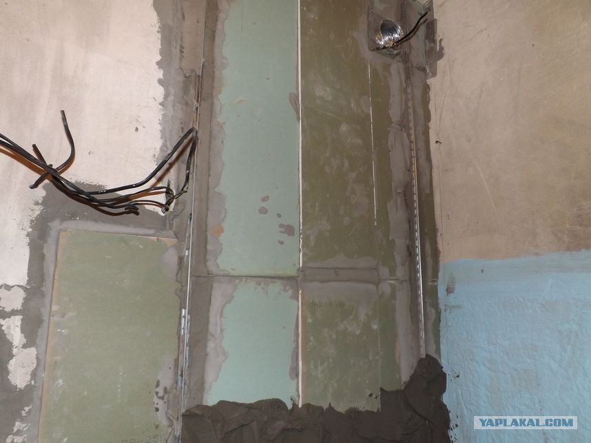 и потихоньку, грунтуя каждый слой, выровняли часть стены (не считая угла со сливной трубой).