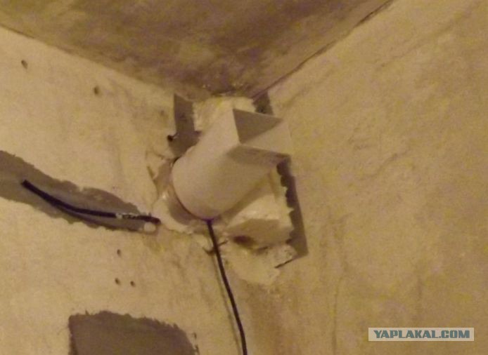 Зайдём в туалет и посмотрим, как там обстоят дела с вентиляцией. Там всё печально и уныло. Вентиляционное окно стоит прямо за сливной трубой. Засада такая. Сломал гипсовую решетку в окне. Перфоратором расширил окно сверху справа и снизу слева, немного под углом. (пунктир)