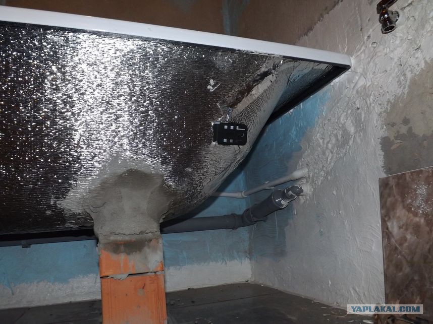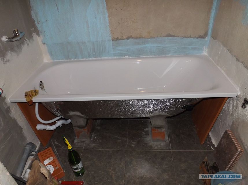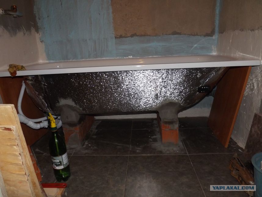 Лежавшая всё это время в зале, ванна наконец-то заняла своё законное место. Правда, прежде была утеплена теплофолом, который приклеили на монтажную пену, швы залепили алюминиевым скотчем. В комплекте с ванной шли ножки. В большинстве магазинов, кстати, они идут за отдельную плату! Что можно сказать с увереноостью - денег своих они не стоят, так что при случае не берите. Они ужасны. С одной стороны удобно - ножки поставить просто и быстро, они регулируются по высоте, но... Ванна на них очень шаткая, не внушает никакого доверия, ну его нах! Купили кирпичи с цементно-песчаной смесью в замен ножек этих. После напряженной работы, удалось-таки поставить ванну на кирпичи, ровно поставить. Раствор после смачивал переодически, чтобы не трескался.