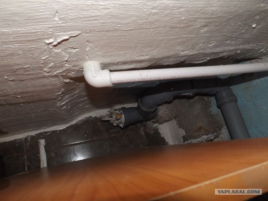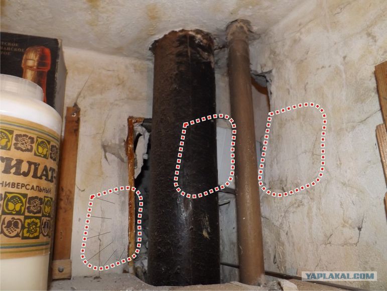 Стена отсырела насквозь. Даже поставил обогрейку, чтобы сохла быстрее. Время шло, но стена не просыхала. Вызвали сантехника на помощь. Через пару дней он пришёл, сказал, что надо менять трубу. Надо отметить, что такие трубы меняют за счет управляющей компании, т.к. они как бы не принадлежат собственнику помещения, а вот ответвления от стояка уже за счет собственника. Пришлось подискутировать с УК по этому поводу. Сантехник ушел и через пару дней пришёл с коллегами. Совет решал, как заменить отрезок трубы с наименьшими потерями, помогали им в этом нелегком деле какие-то заклинания. Совет удалился и через пару дней, когда меня не было дома, они заменили-таки отрезок чугунного стояка четырьмя отрезками пластового. Когда я рассмотрел работу сантехников, заметил скол на чугунной крестовине в месте состыковки с пластиковой трубой.