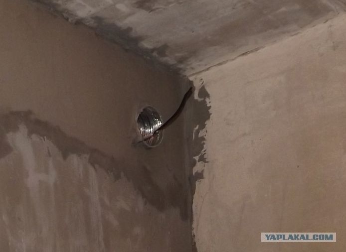 В ванной угол между стеной и потолком тоже запенил, только сначала засунул в дыру эту металлическую сетку на глубину стены, чтобы пена держалась и не выпирала со стороны туалета.