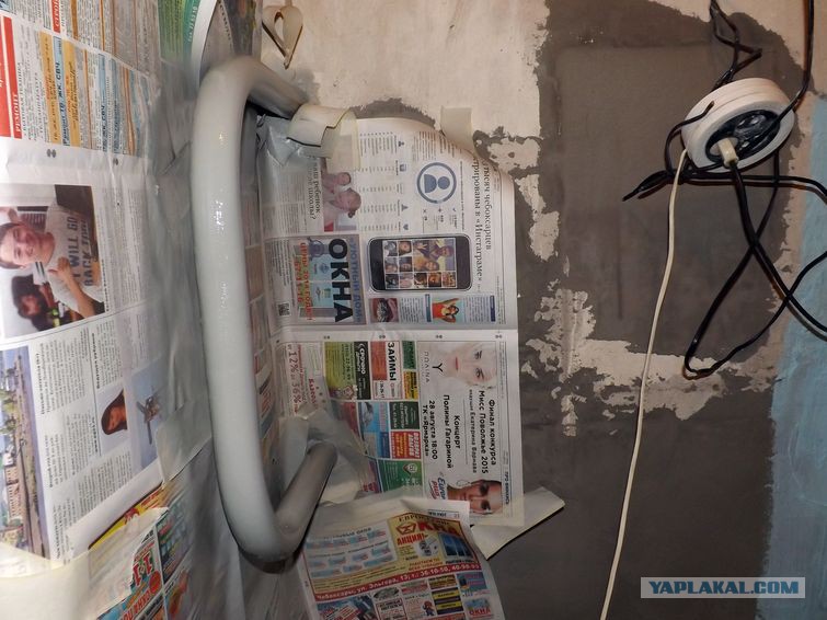 И из этого скола текла вода! Вызвали сантехника. Через пару дней он пришёл и залипил бинтом и цементом бандаж на проблемное место. Он мне и закупоренный торец сливной трубы в ванной советовал цементом замазать. Семь бед - один цемент. Уже не помню сколько дней сохла стена. Но уже стало понятно, что не скоро можно будет плескаться в ванне.
