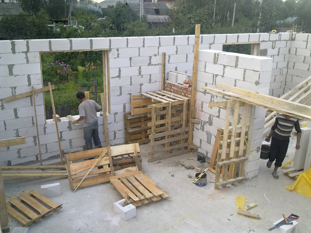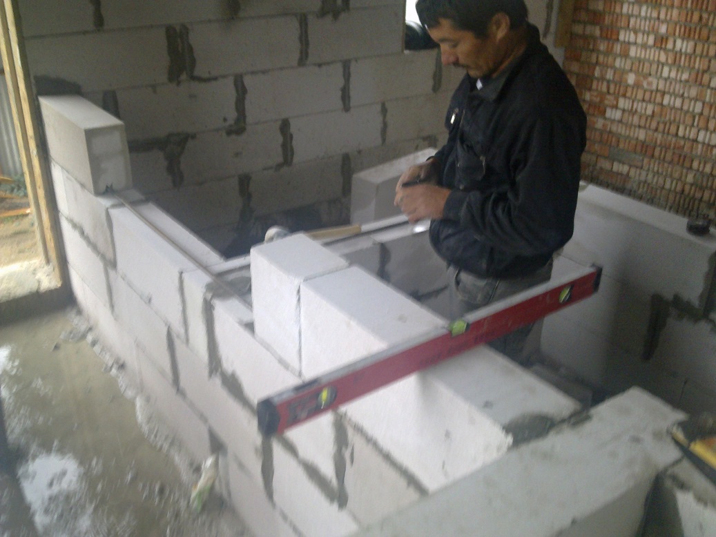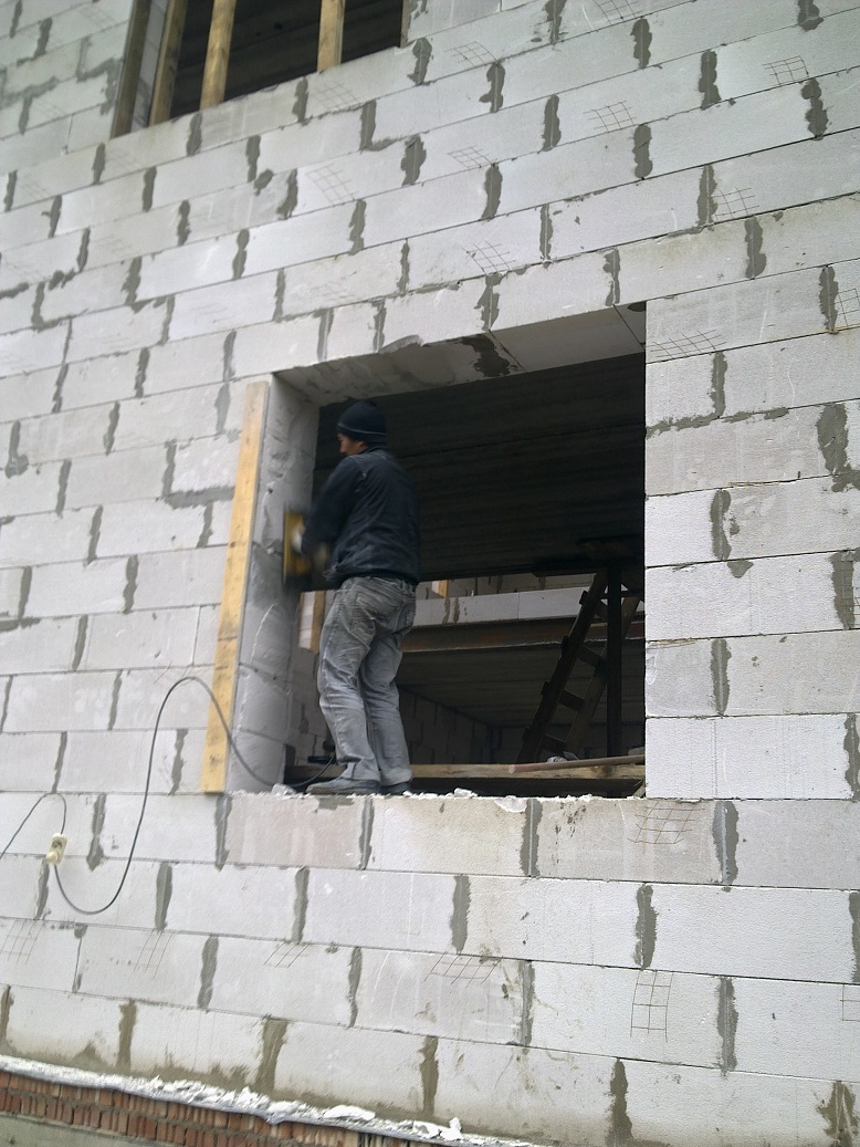 выкладывают внутренние стены, арматуру закладывали где через 2, где через 3 ряда, я так и понял, по какому принципу. Объяснял им, что надо каждый третий ряд выкладывать, но бестолку. По крайней мере, хуже было бы если б не было арматуры