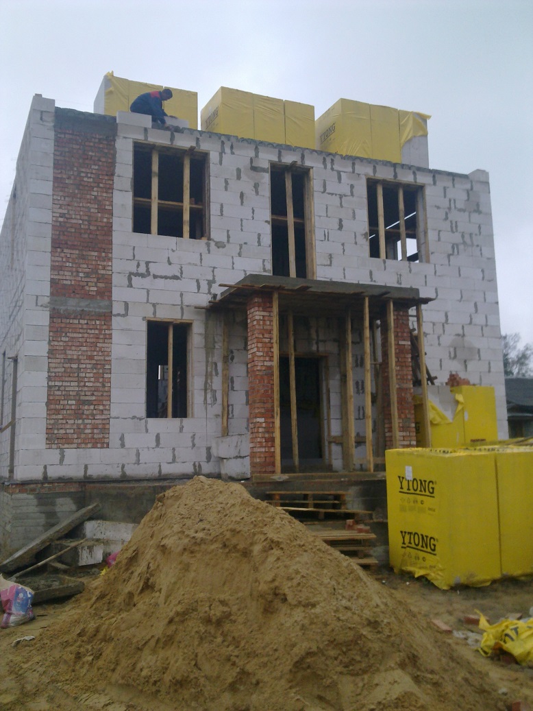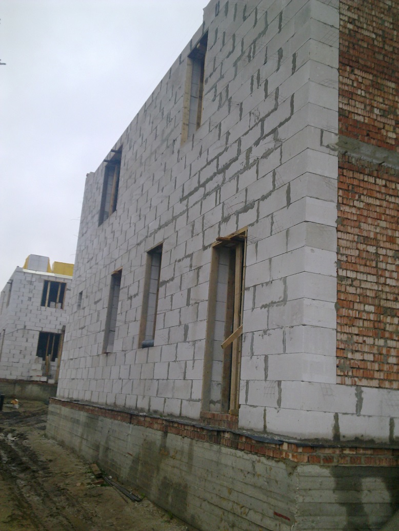 положили перекрытия второго этажа, заснял вокруг дома, там , где на цоколе видна красная метка - это "нулевой" уровень, т.е. уровень земли, потом подымал.